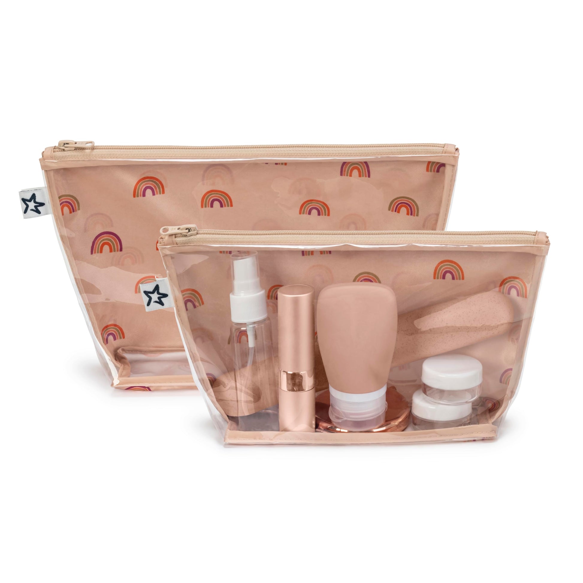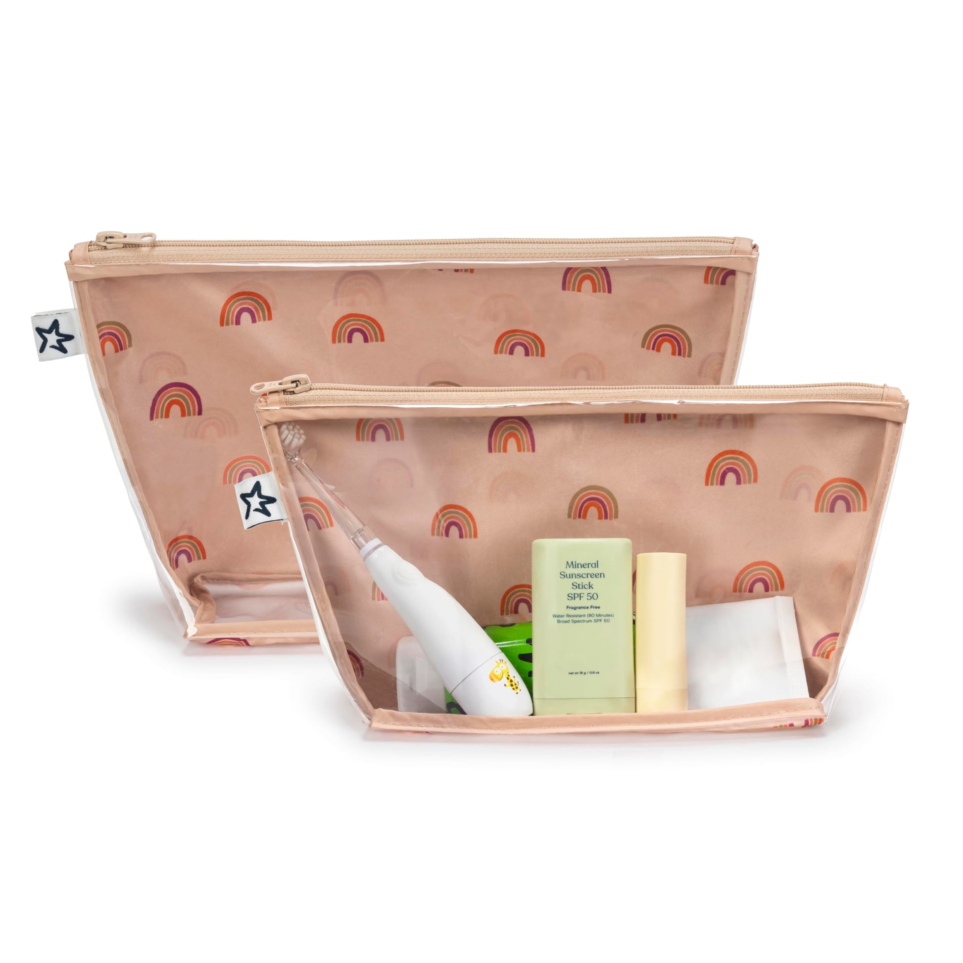 Tiny Twinkle Mess-proof Travel Bags, Airline Compliant, Zipper Closure, Clear Front Pouch, Diaper Bag Packing, Toiletry or Cosmetics Organizer 2 Pack Set (Boho Rainbow)
