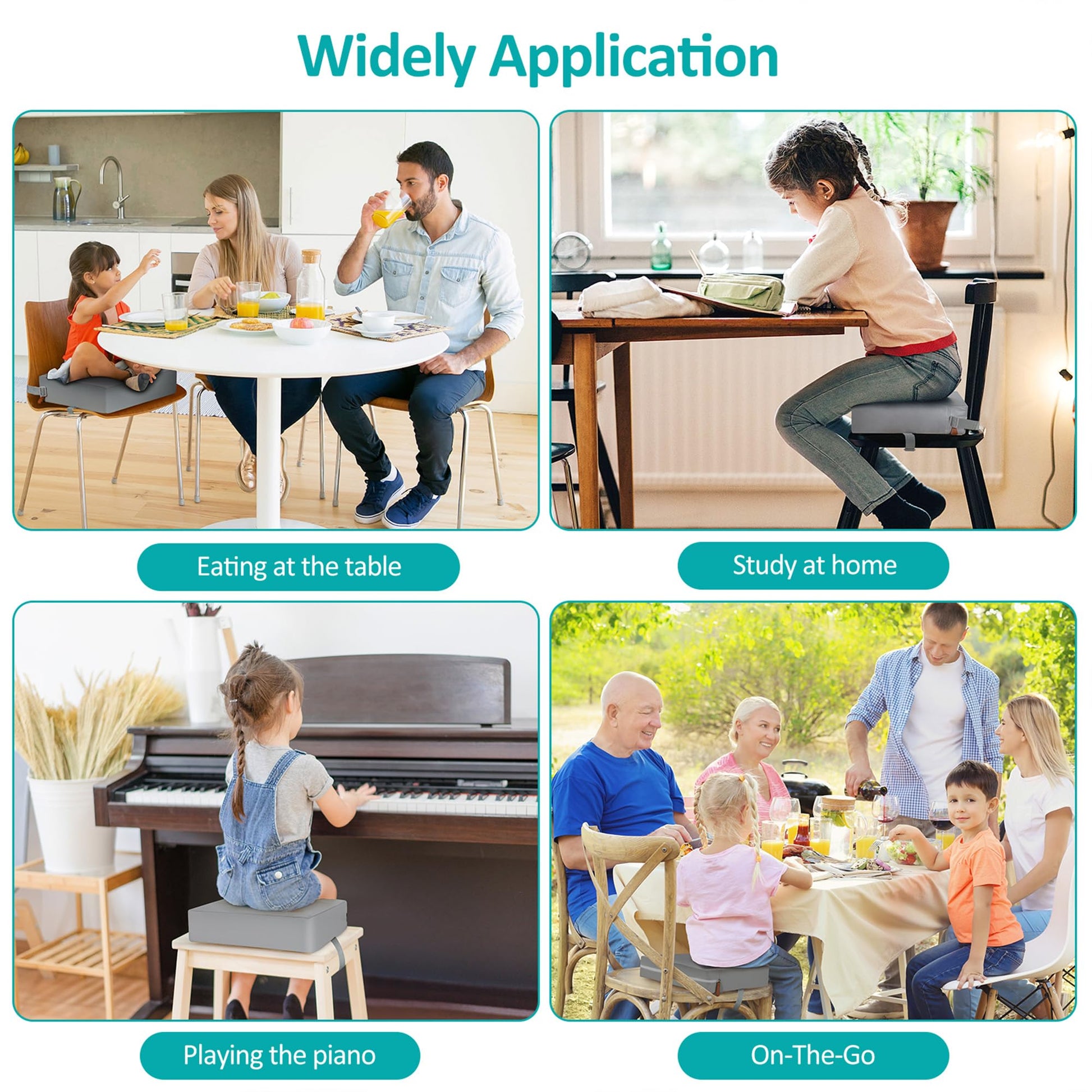 - SAFE & NON-SLIP - The booster seat dining has two adjustable seat belts,which can firmly fix the booster seat cushion to the chair from the bottom and back,the bottom of booster is made of non-slip silicone,so that booster seat dining is not easy to slide,ensure the safety of kids when eating on the table.The extend length of two adjustable seat belts is 20 inch-30.5 inch,so it is suitable for most dining chairs