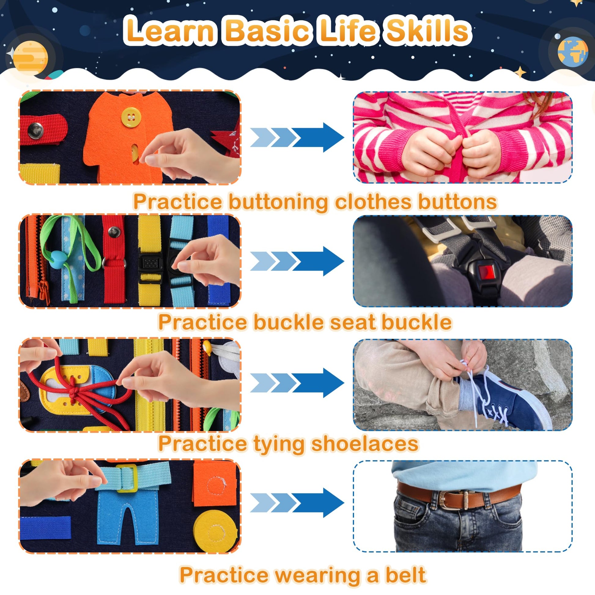 - [PERFECT GIFT FOR KIDS] : Our activity board for toddlers 1-3 features beautiful space elements on the cover, symbolizing freedom, self-confidence and happiness. Both boys and girls will love it! This combination of children's travel and educational toys makes it a creative and practical gift for boys and girls on birthdays, Christmas, New Years, Halloween, Easter, and Thanksgiving