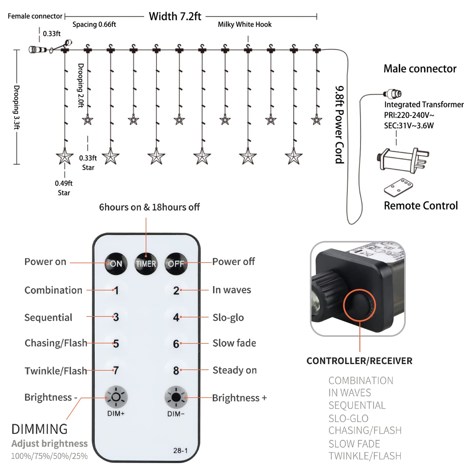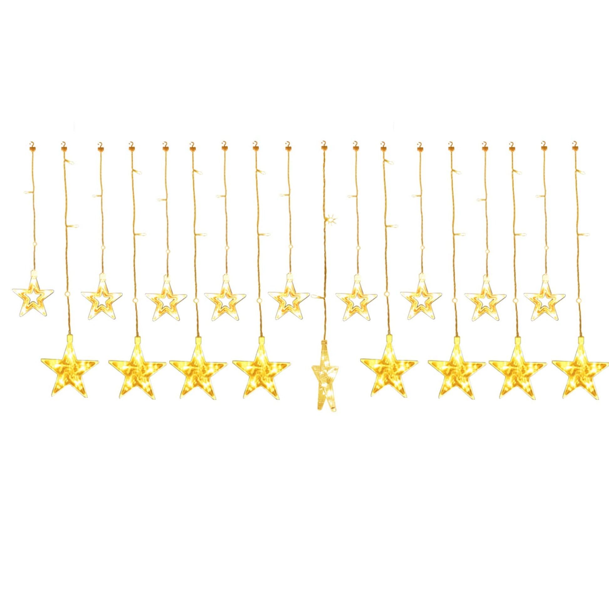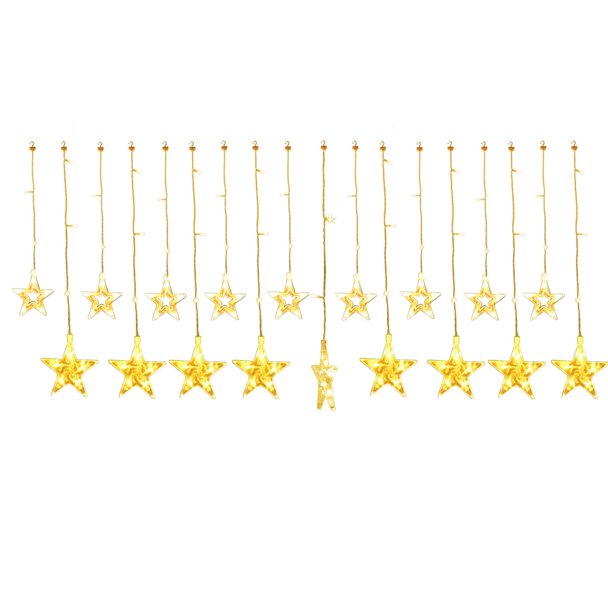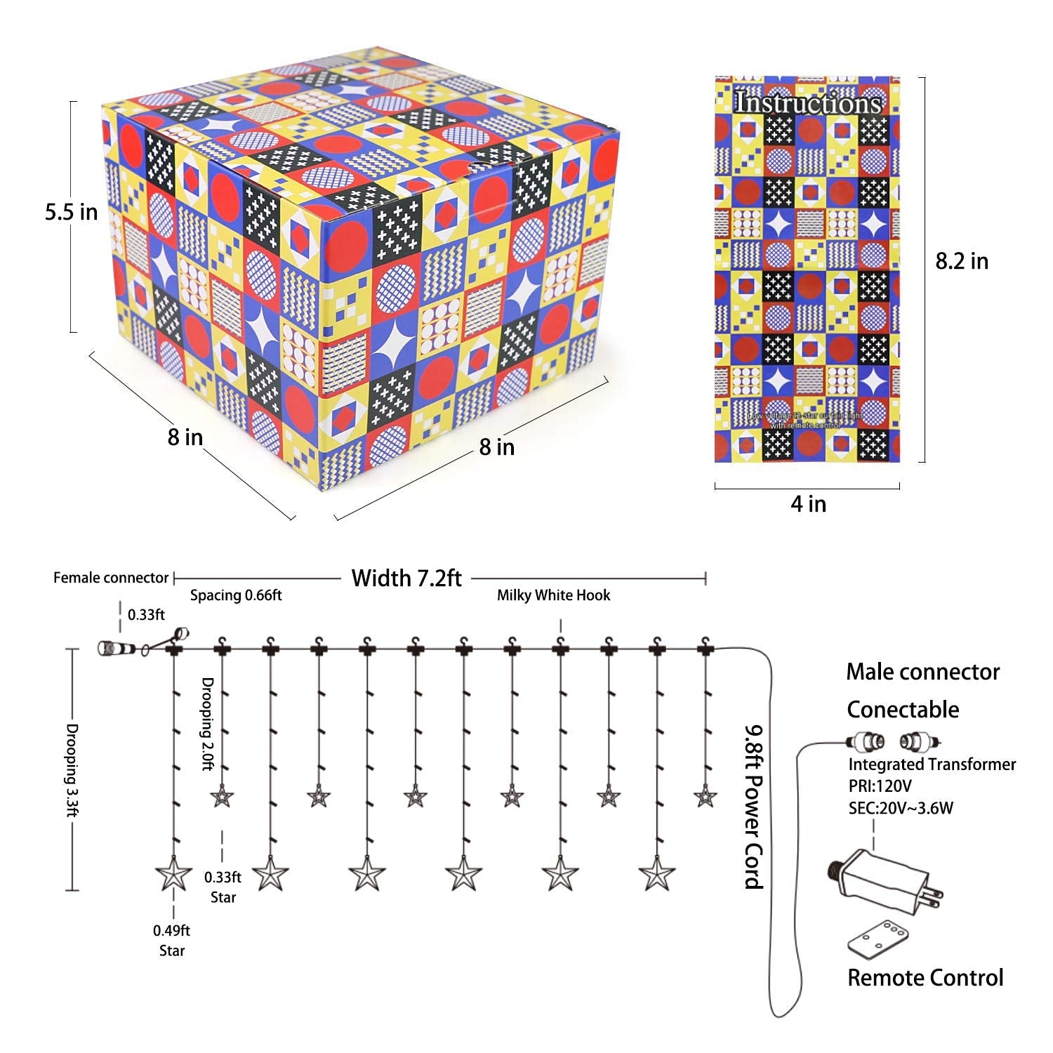 - Widely Decorative Occasion: 7.3ft in width, 3.3ft in height, extendable, Star curtain Lights with 138 Led, 12 star ornaments, 6 big and 6 small stars. The diameter of big stars is 6in, and small stars is 4in. Lights can be connected to each other. Perfect for Christmas, Festival, Holiday, Party, Xmas, Home, Window, Walls, Doors, Trees, Eaves, Balcony, Yard, Bedroom, Patio, etc. Note, Our big stars are solid, not hollow and with a remote control.