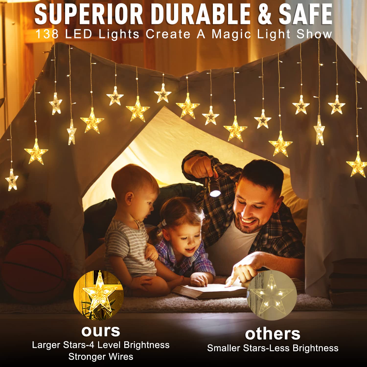 - Energy Saving: Thanks to Led Technology and Low Voltage, the light with cold light sources is soft light, no strobe, safe to touch and safe for kids. Star Curtain Lights create a warm atmosphere.