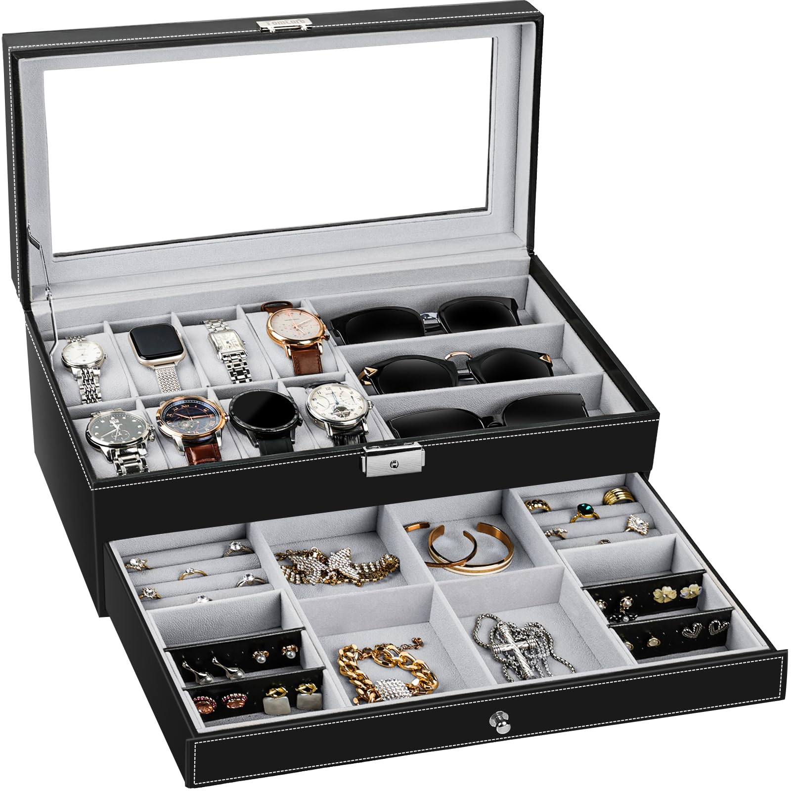 TomCare Watch Box Watch Case Jewelry Organizer Holder Jewelry Display Box Case Sunglasses Storage Organizer Lockable with Glass Top and PU Leather for Men Women, Black