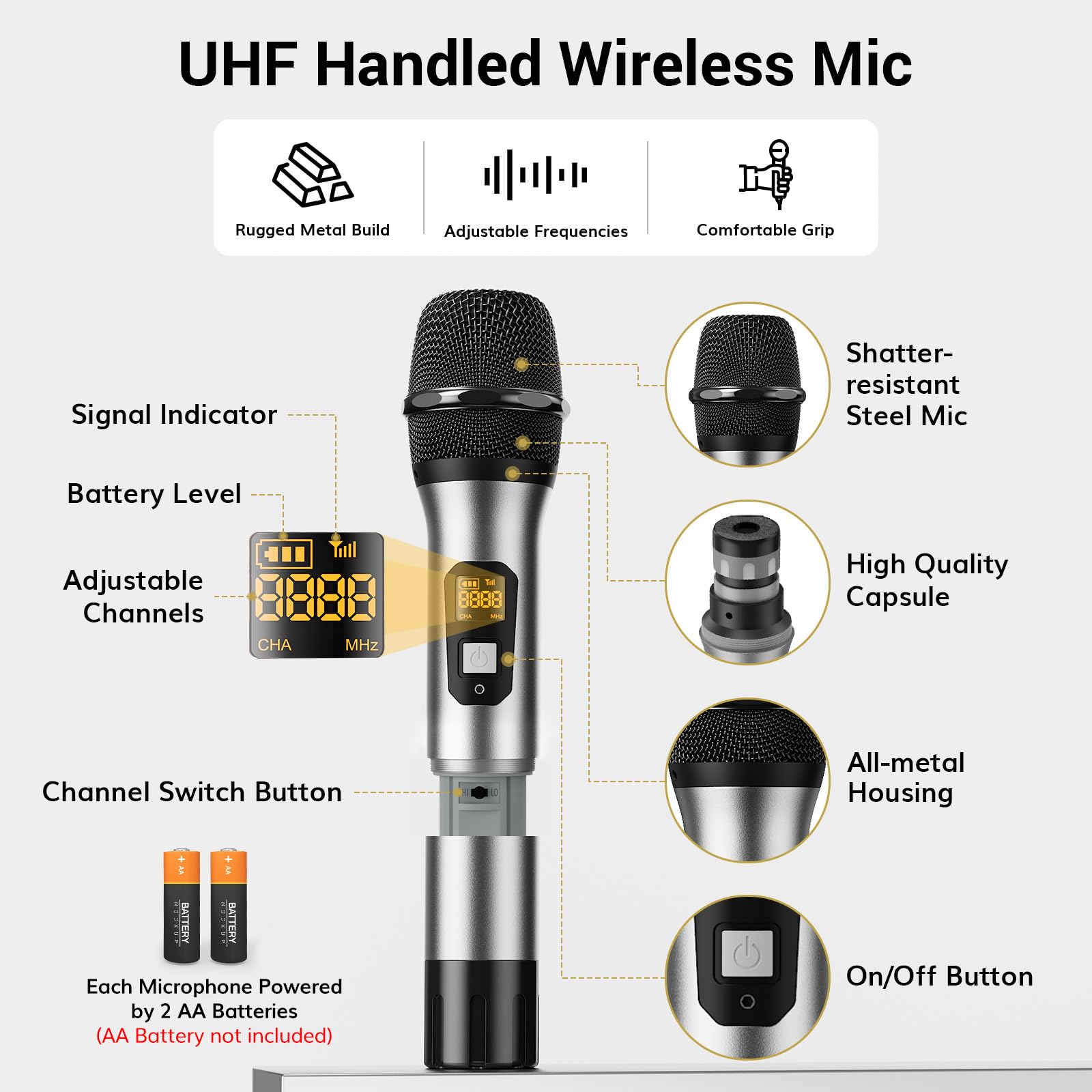 - Wide Compatibility: Automatically pair transmitters for convenient plug-and-play. Easy to connect to mixers, speakers, karaoke machines, power amplifiers and more. Each wireless mic and bodypack requires 2 x AA batteries (not included).