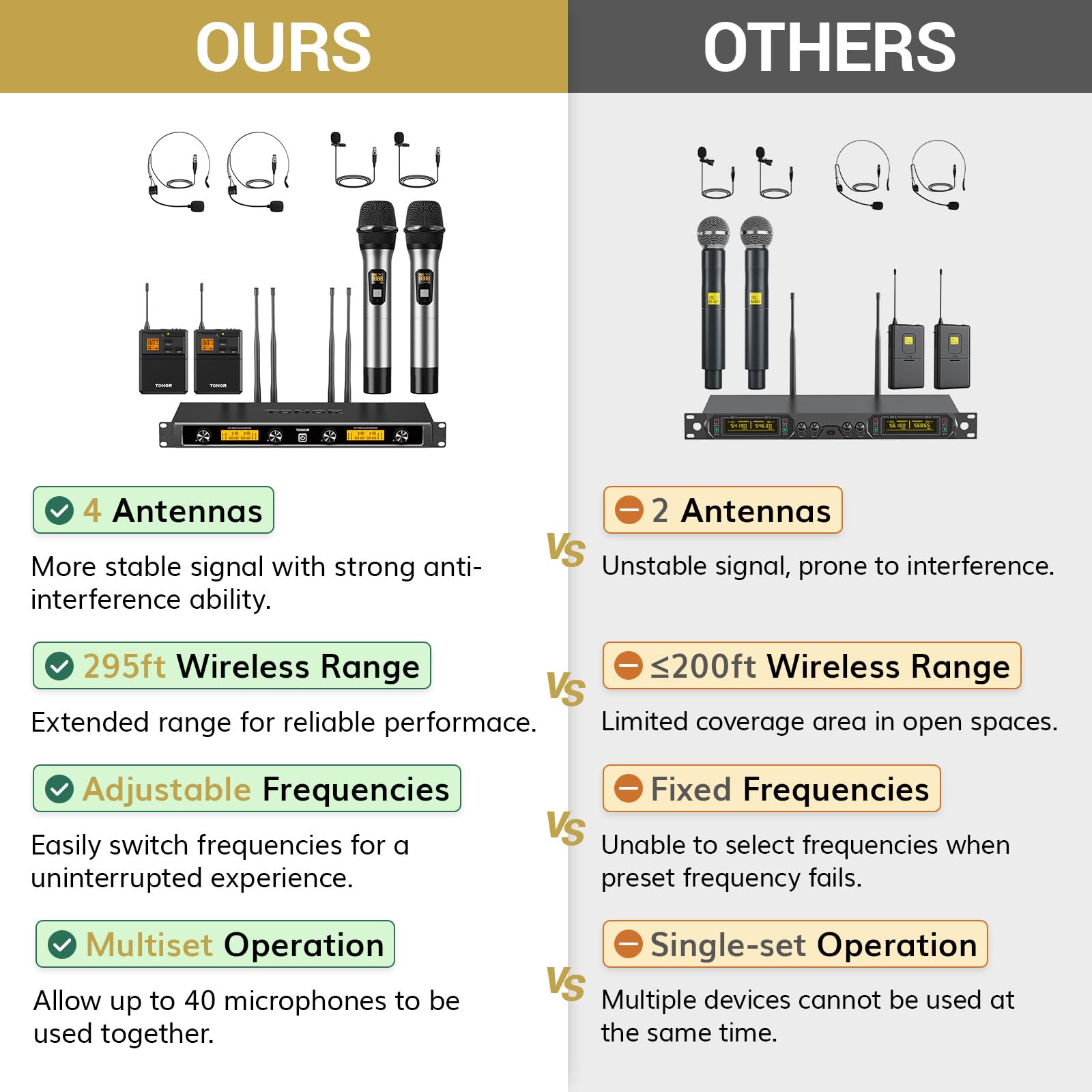 - 40 Adjustable Frequencies: Our wireless microphones offer 10 frequency options per mic and bodypack, allowing for versatile performance with a total of 40 channels. Easily switch between frequencies for a seamless experience, even in challenging environments.