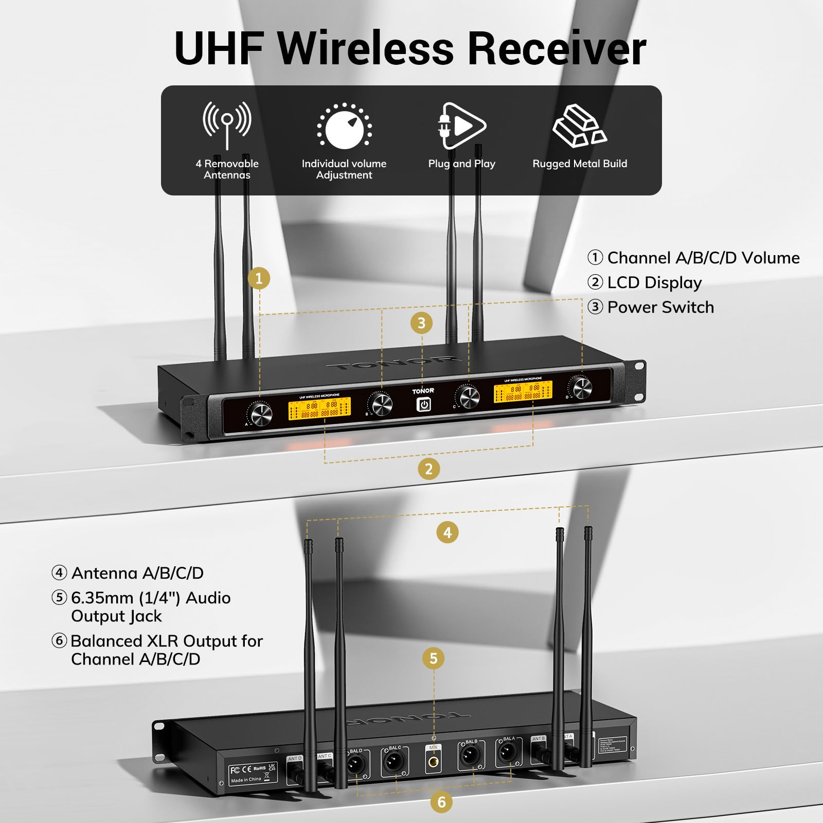 TONOR Wireless Microphones System with 4x10 Channels Dynamic Handheld Mics 4 Antennas for 295FT Long Distance Mic with Adjustable Frequencies Auto Connect for Singing Party Church Karaoke, Silver&Red