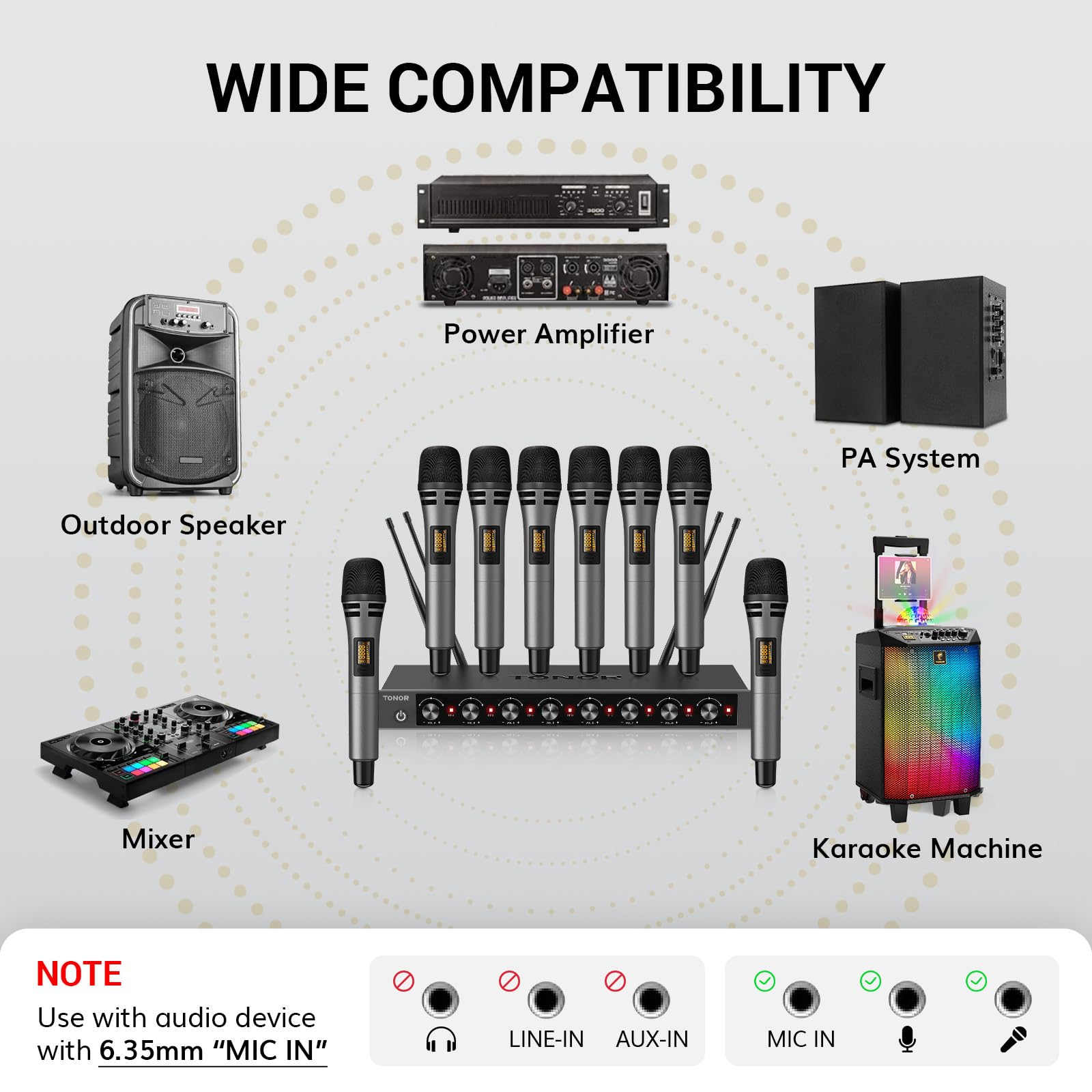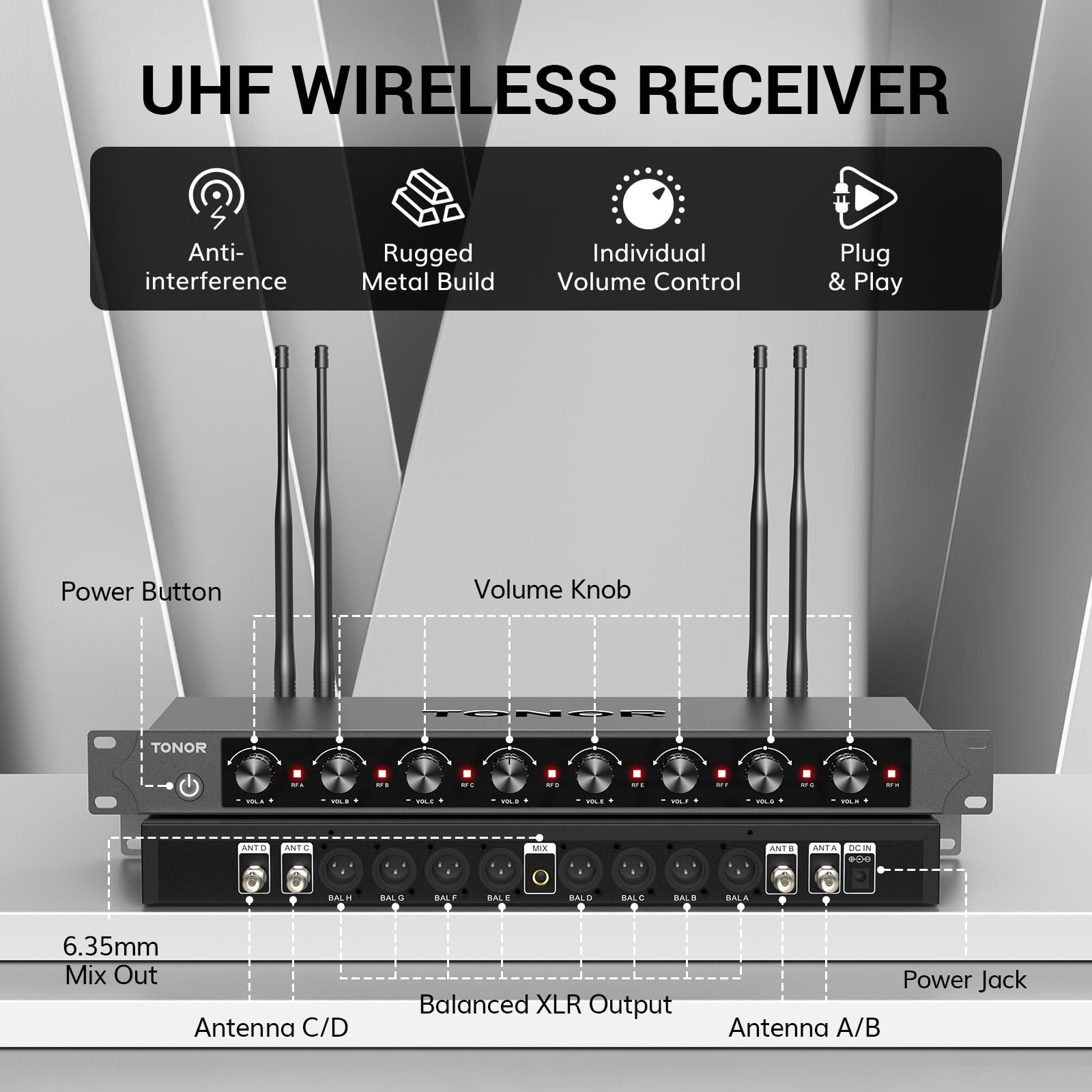 TONOR Wireless Microphones System with 8x12 Channels Cordless Handheld Microfono Inalambrico, 295FT UHF Range, Mics with Stable Signal, Quick Mute for Karaoke Singing Party Church Wedding PA Speaker