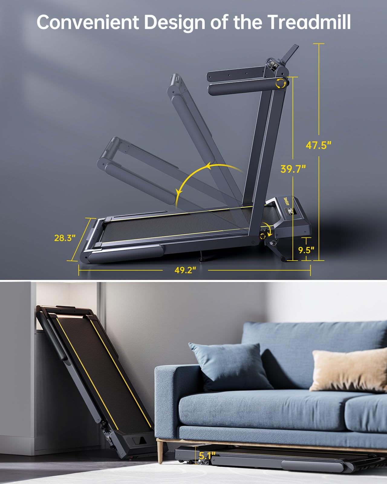 - 🏃♀️【Non-Assembly & Space Save Design】TOPUTURE 2 in 1 folding treadmill comes fully assembled and is ready to use after unpacking. The quick release snaps instantly turns the 52.3'x28.2'x5.1' walking pad into a 49.2'x28.2'x447.5' running treadmill. Built-in transport wheels make this home treadmills easy to move, you can place it under your bed or sofa to save space.