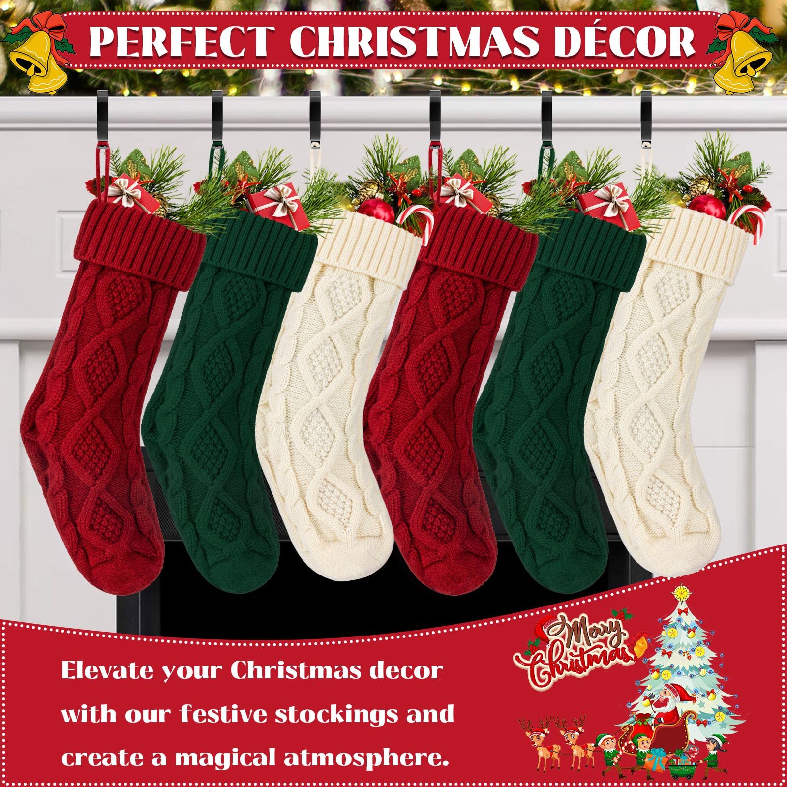 - 🧦 🧦【Christmas Stocking Set】Get a total of 6 Christmas stockings in this set, measuring 18 inches in length and 5 inches in width. Available in three charming colors – Burgundy, Ivory White, and Green, with two stockings per color. Each stocking comes with a sturdy metal fireplace hook for easy hanging, instantly adding a festive touch to your home.