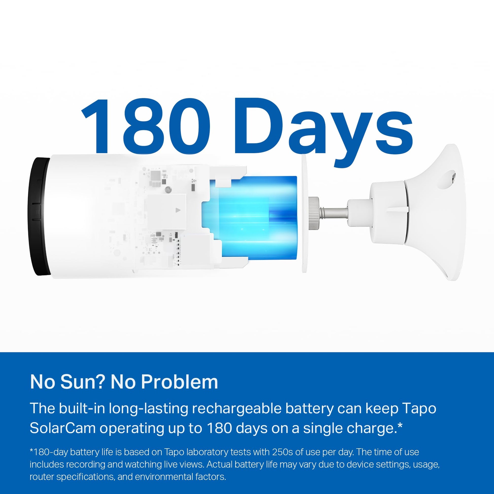 - 【Endless Power from Solar Energy】The Tapo SolarCam C402 KIT harnesses the power of the sun to keep your security system running smoothly. The innovative design includes a modular solar panel that continuously charges the built-in battery, ensuring your camera remains powered. Even on cloudy days or during extended periods without sunlight, the fully charged battery can provide up to 180 days* of uninterrupted performance. Experience the convenience and reliability of a truly zero-touch maintenance system with this solar-powered solution.