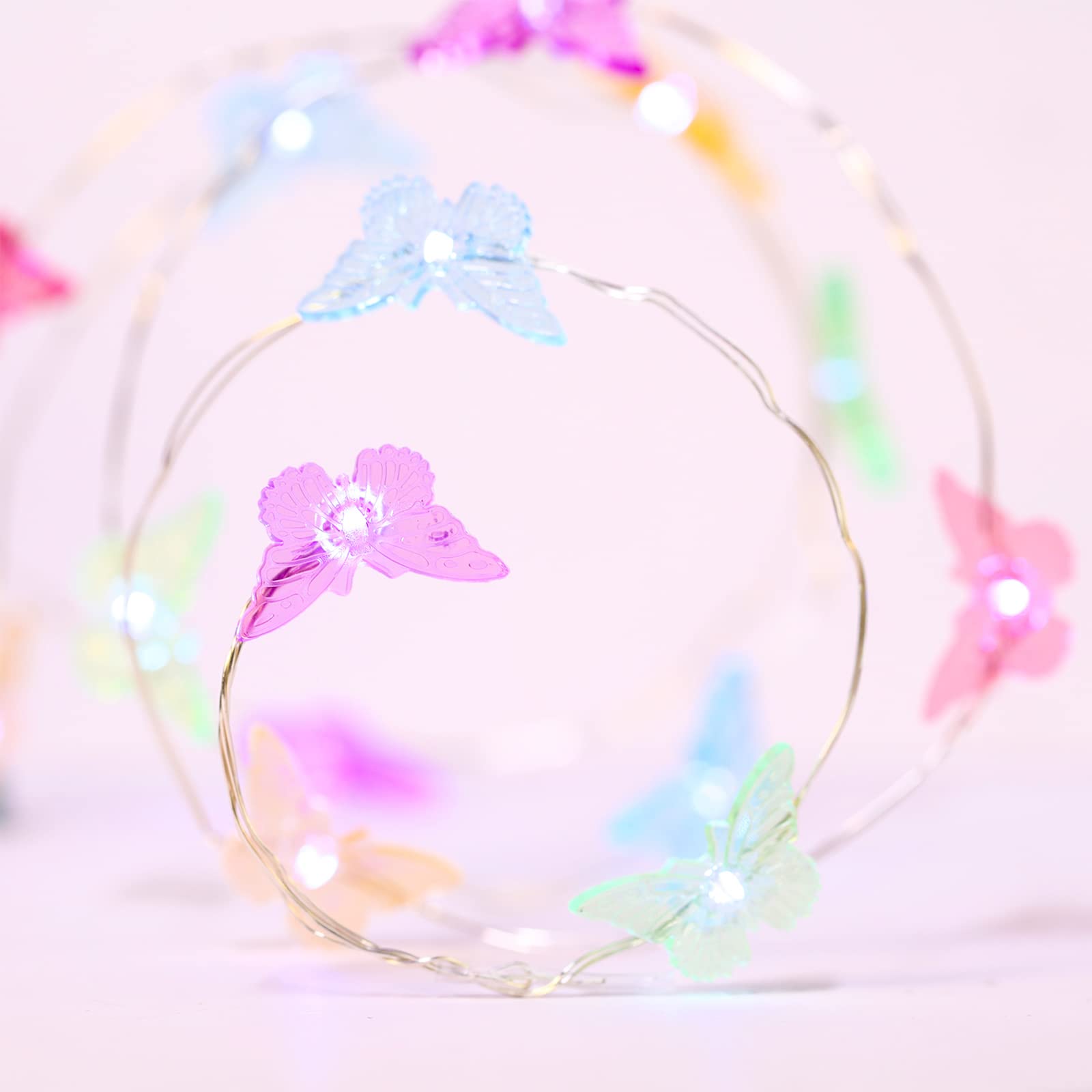 - Adorable decoration:10 feet silver plated copper wire and 40 LED colorful butterflies lights; This battery operated butterfly in the shape of charming clear colorful butterflies design will beautifully dress up your tree, fence, front path or porch, creating a warm and sweet atmosphere; Both can indoor or covered outdoor usage