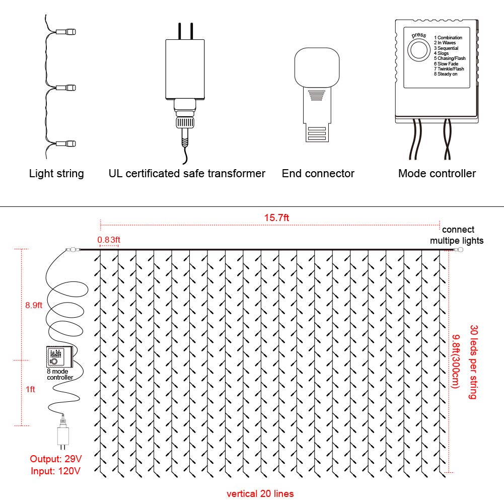 - EXCELLENT QUALITY: 15.7ft*9.8ft(width*length), 600 WARM WHITE LED string lights. UL Certificated Output and wire: 29V Voltage Safe Curtain Lights with UL certified, leads to 29V safe output by UL plug-in transformer.