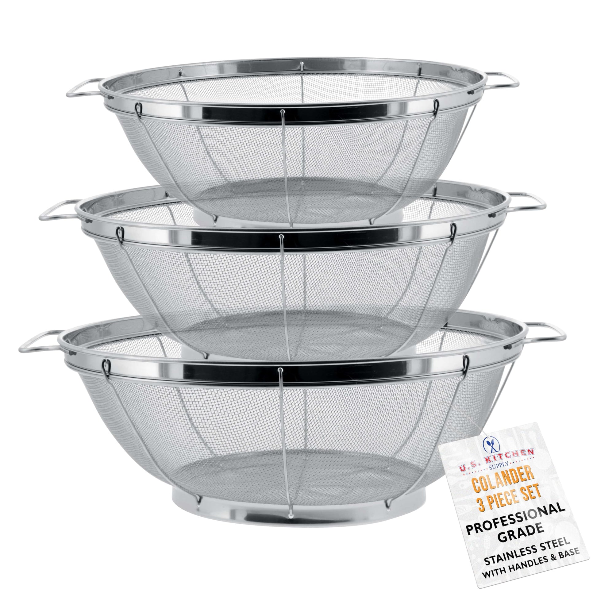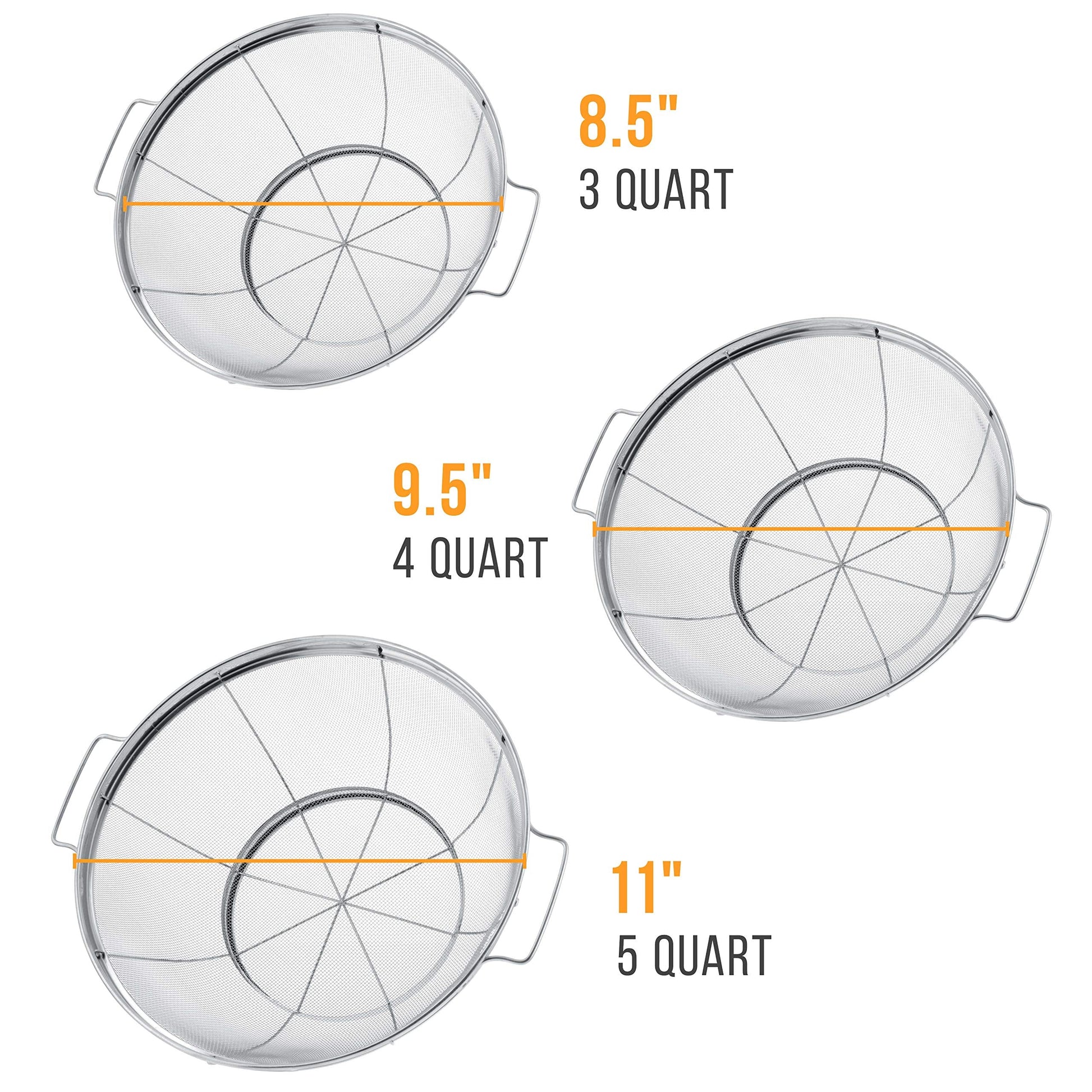 - 3 Professional Grade Mesh Colander Baskets: 3 sizes of premium high performance round stainless steel mesh colander net strainers with handles. They're perfect for sifting and straining wet or dry ingredients. The colanders feature a sturdy outer mirror finished wide rimmed framework design on both the top and the resting base on the bottom. The firm wire along the outer sides of the rust-proof firm mesh netting keeps the baskets in shape and sturdy while in use.