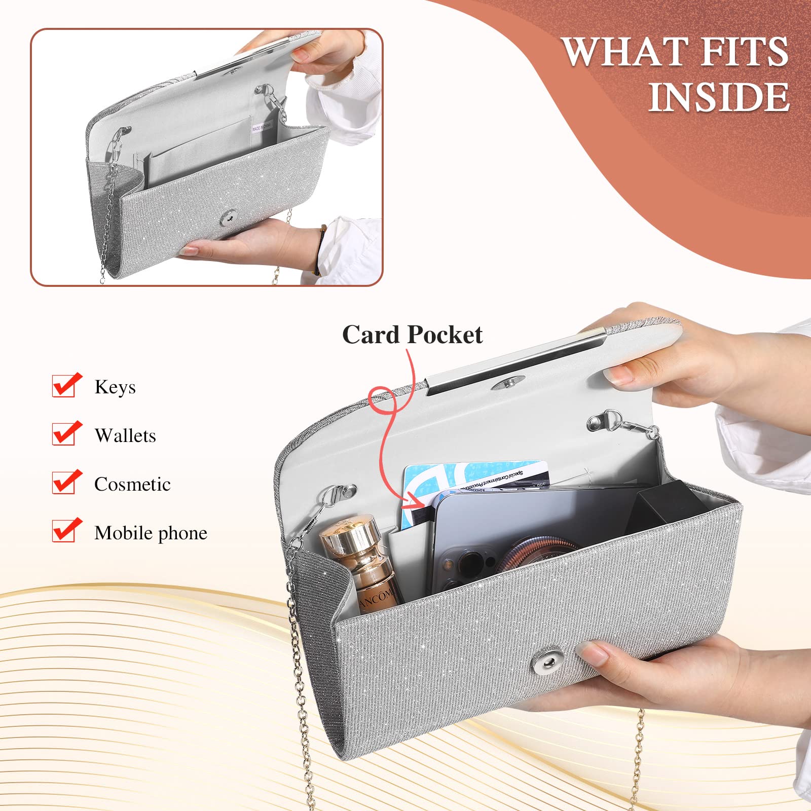- Perfect size: The dimensions of this silver evening bag are 22 * 5 * 12 cm / 8.66 * 4.72 * 1.97 inch, which is enough to hold your phone, keys, cards, mirror, lipstick, and other makeup essentials without feeling too bulky.