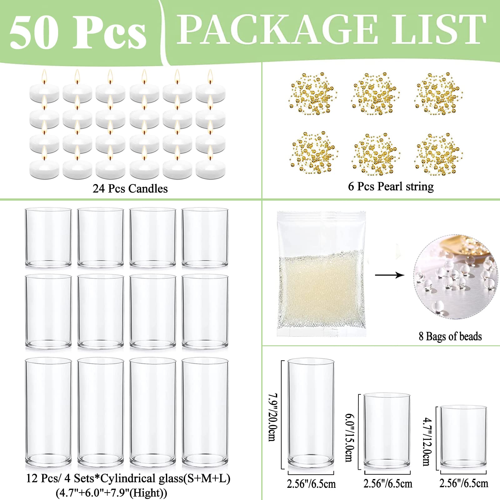 - Products Include: There are 12 pieces of cylinder glass Vases; 24 pieces of white floating candles; 8 packs of vase filler of 10000 pieces and 6 pieces Artificial Pearl String, which can be put into use separately or in combination to meet your daily use and replacement demands