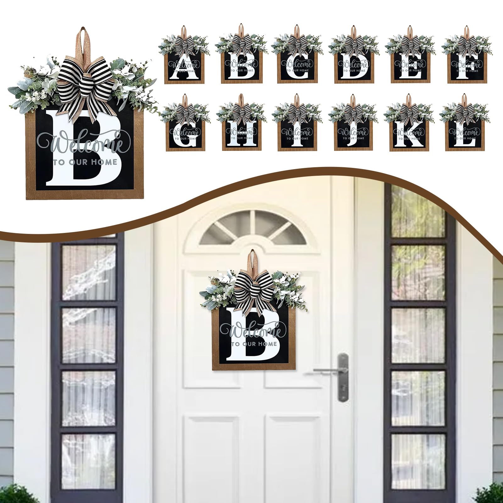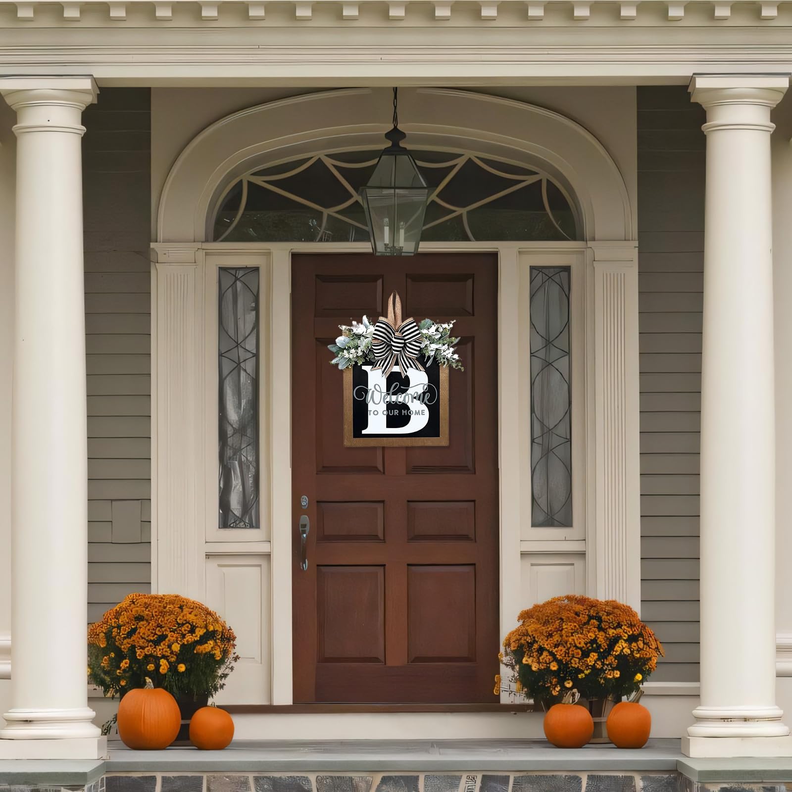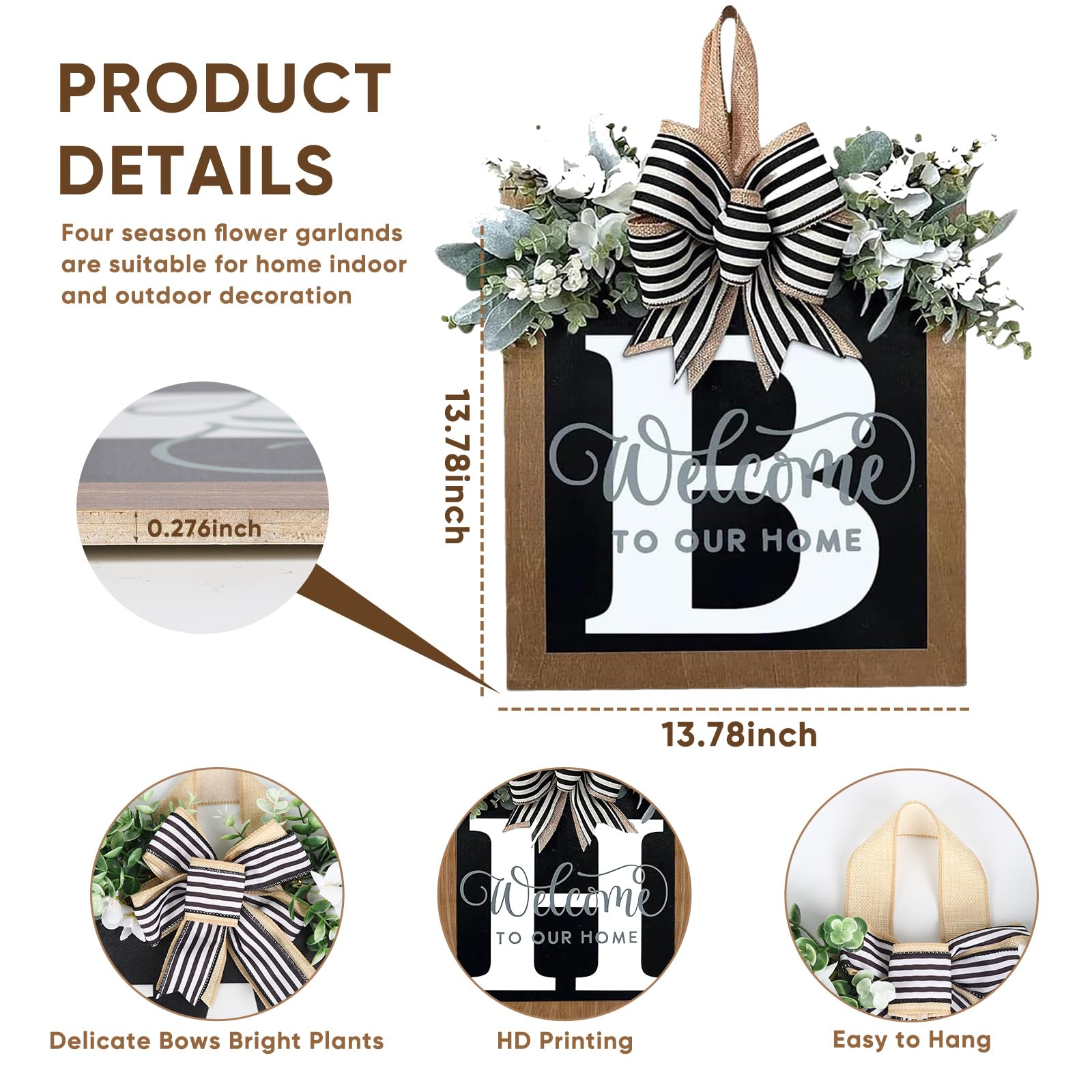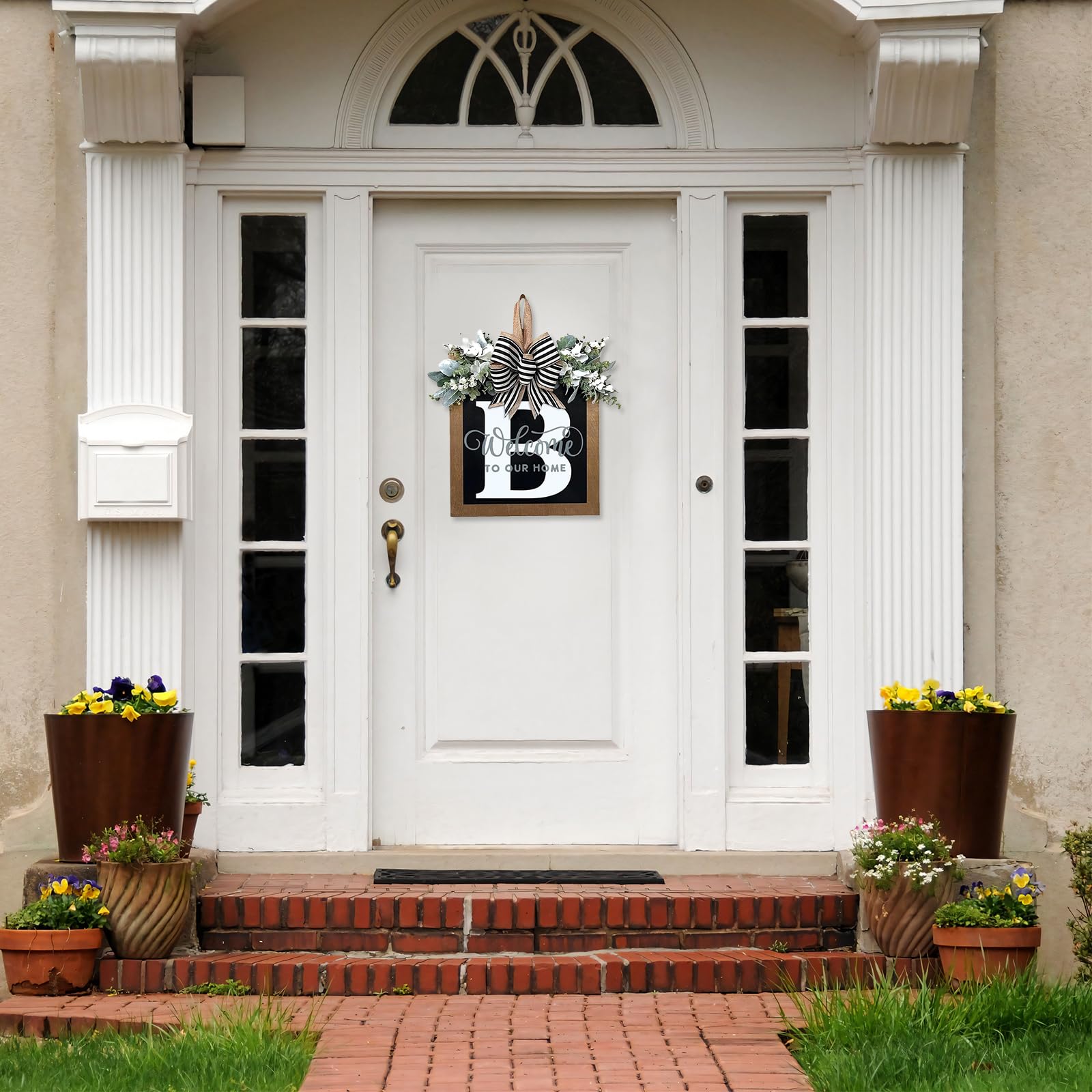 Ultra Large 14'' Last Name All Year Round Front Door Wreath with 26 Initial Letter Welcome Sign All Seasons Eucalyptus Garland and Bow Wreaths for Front Door Porch Farmhouse Decoration (B)