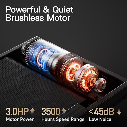 Details: Whisper-Quiet Brushless Motor Unleash the power of our advanced brushless motor, designed to deliver a robust 3.0 HP for maximum efficiency and minimal maintenance. Cruise up to 8.7 MPH with an ultra-quiet performance of just 40-65 dB, ensuring serene workouts that won't disturb your neighbors.