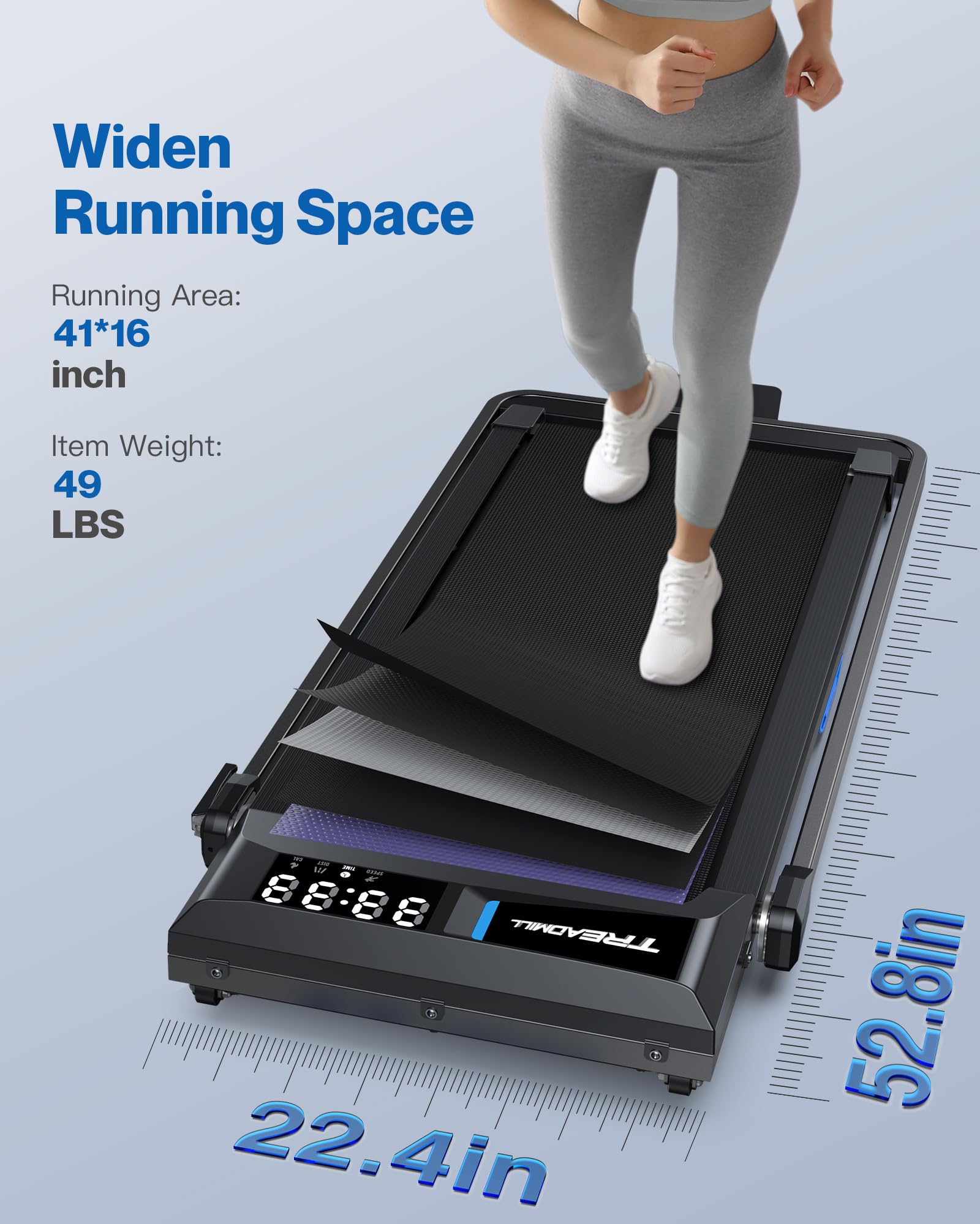 - No Assembly & Easy Store: The walking pad treadmill arrives fully assembled and can be used right out of the box, fold it up and walk away in one easy step, suitable for home, apartment, office use. The compact lightweight design and inner-wheels make it easy to lift and store.