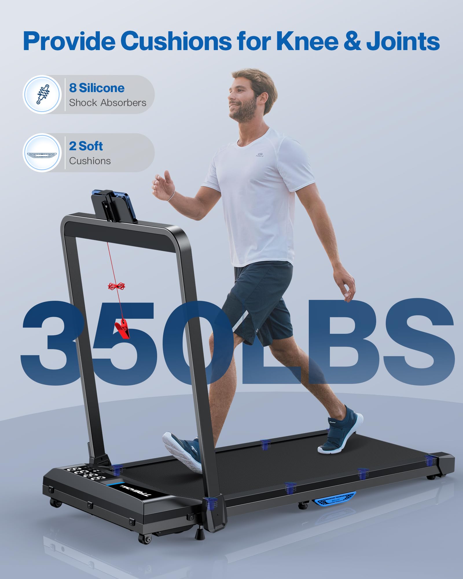 - Anti-Slip Belt & Shock Absorbers: With 5-layer anti-slip running belt, 8 silicone shock absorbers and 2 soft cushions for shock absorption, the treadmill is designed to safeguard your knees and joints, providing a safer and smoother workout experience.
