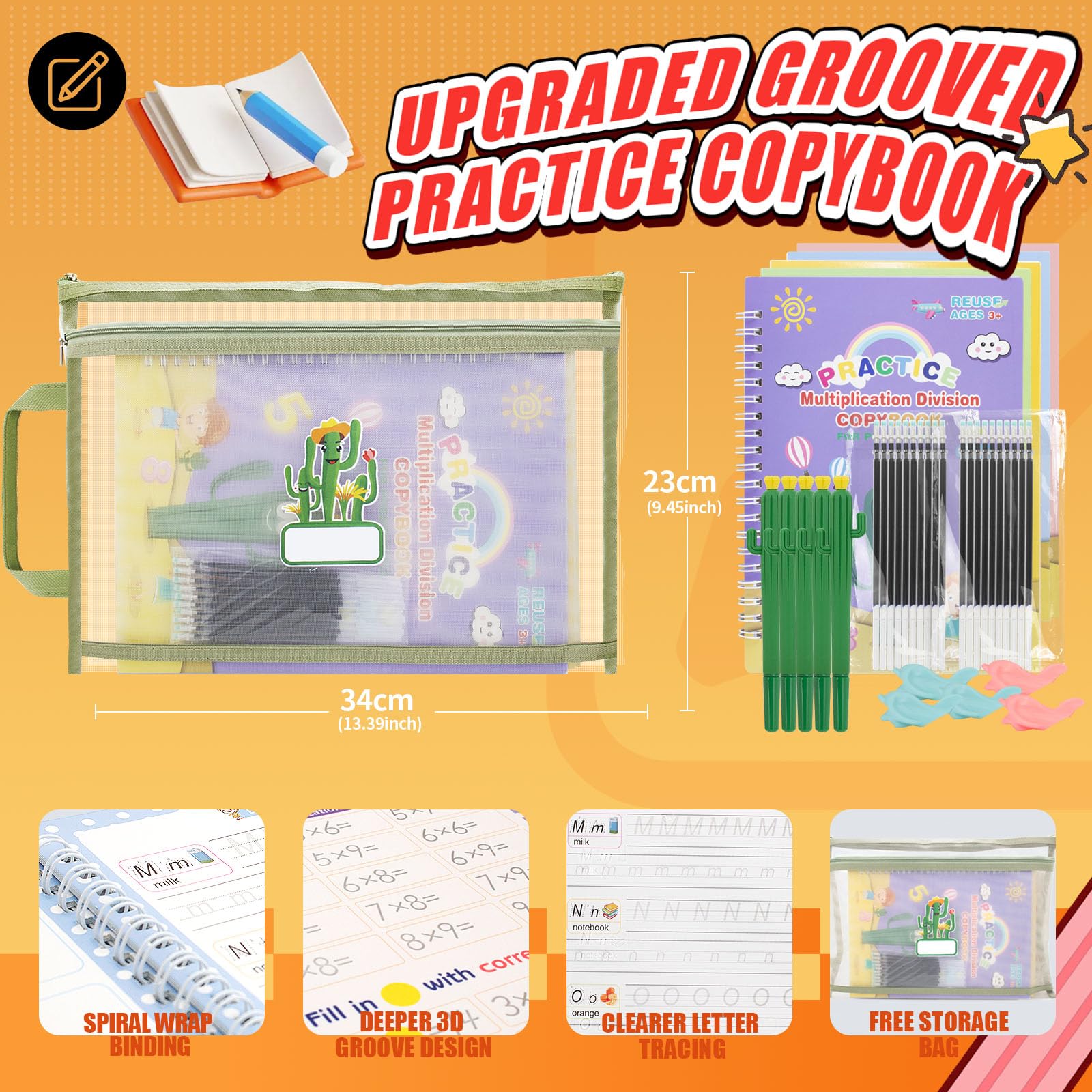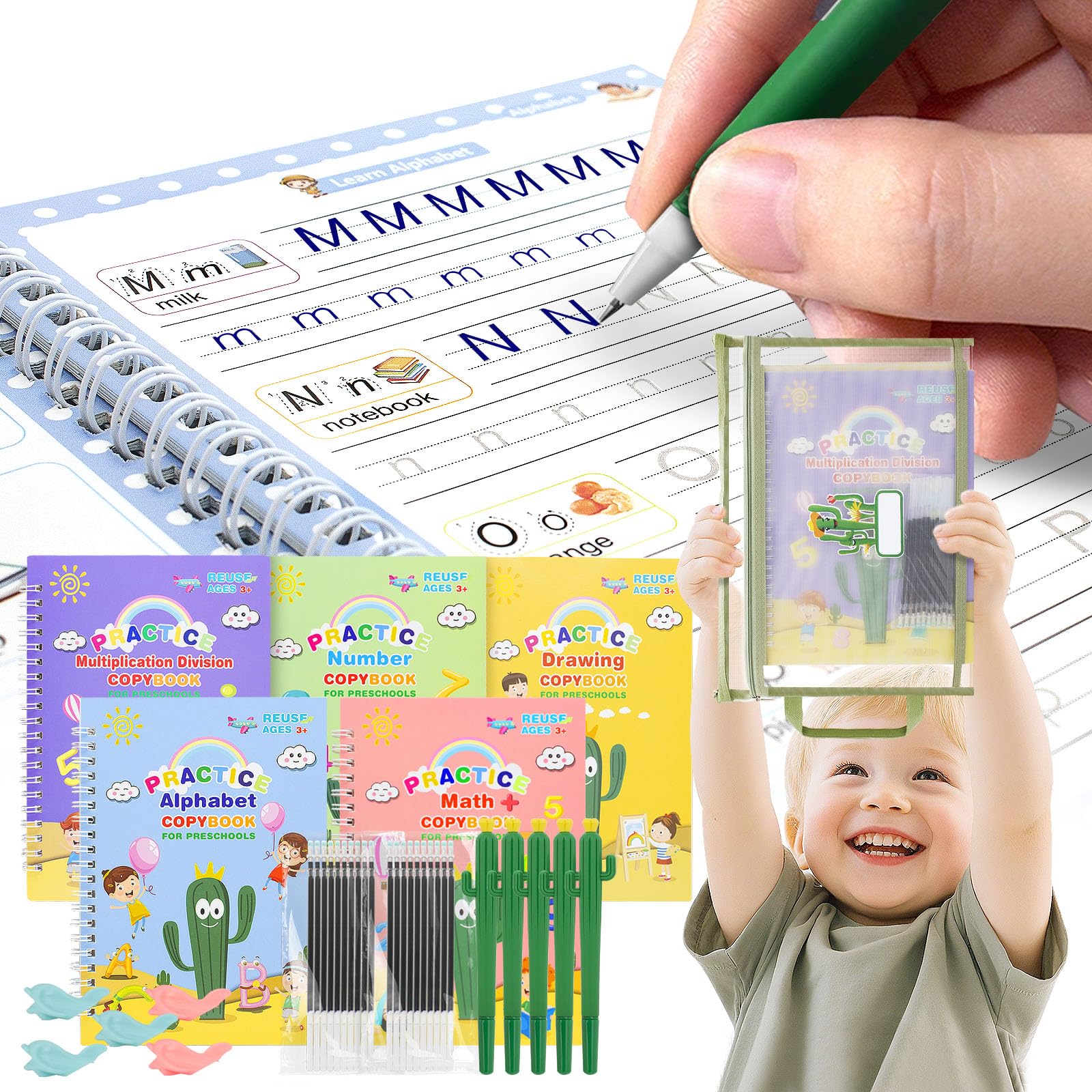 - đă5 IN 1 MAGIC COPYBOOK SETăExclusively designed children's magic practice copybooks, rich in cactus themed elements that signify strength and positivity. This complete set includes 5 writing practice books (letters, numbers, addition, drawing, multiplication and division), 5 cactus pens with 5 pen grips, extra 20 pen refills, and a storage pouch, convenient for kids to practice writing anytime and anywhere.