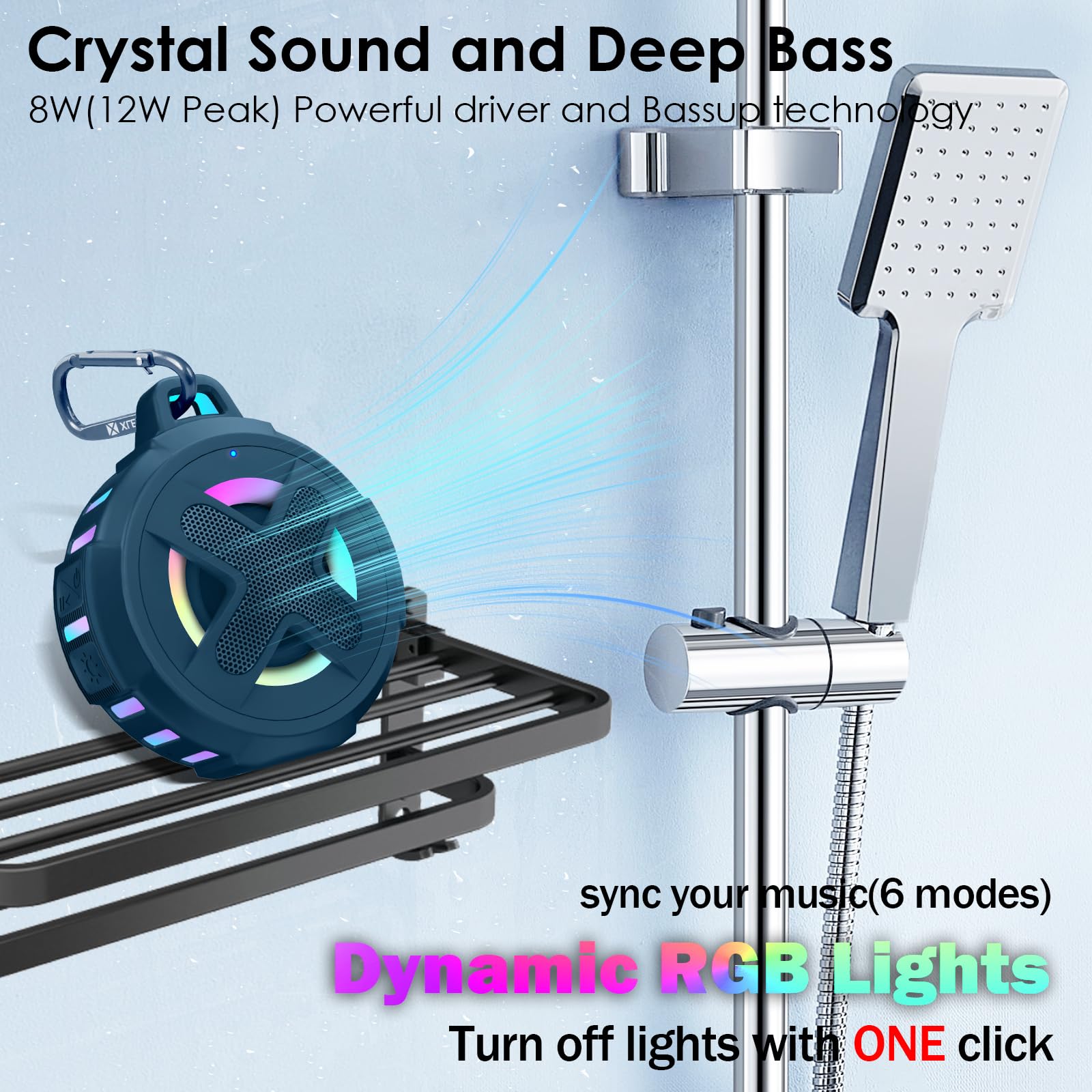 - ♬【6 Modes RGB Light Show】Waterproof shower Bluetooth speaker X8 can light up your life. You can enjoy the RGB light show when you using the shower speaker listen music. 6 modes RGB light let your life become more interesting at night. Our Cool RGB Bluetooth Speaker can be as a gifts for Kids,teens,boys,girls,men, women, your friends or family!