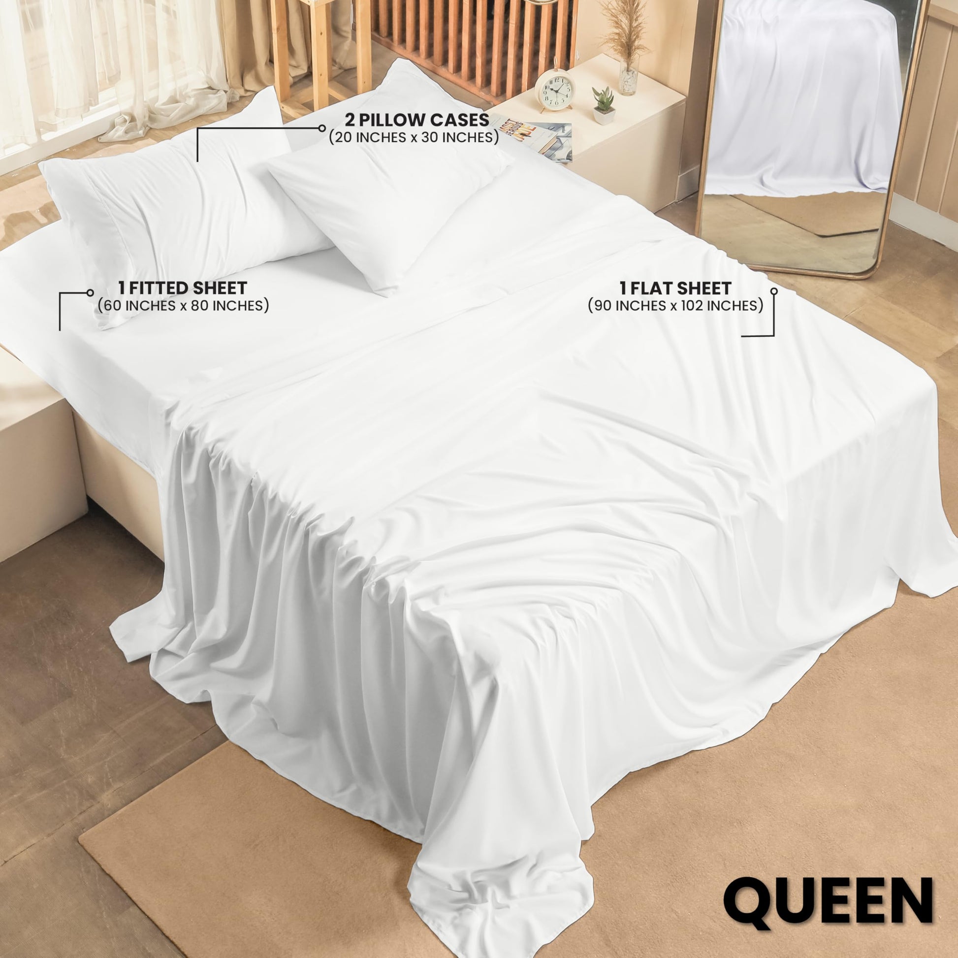 - Queen Sheet Set – 4-piece soft sheets queen size includes flat sheet (90' x 102'), fitted sheet (60' x 80') with 15' deep pocket and 2 pillowcases (20' x 30'). Soft, cooling, and durable queen size sheets set. Ideal sheets for queen size bed set