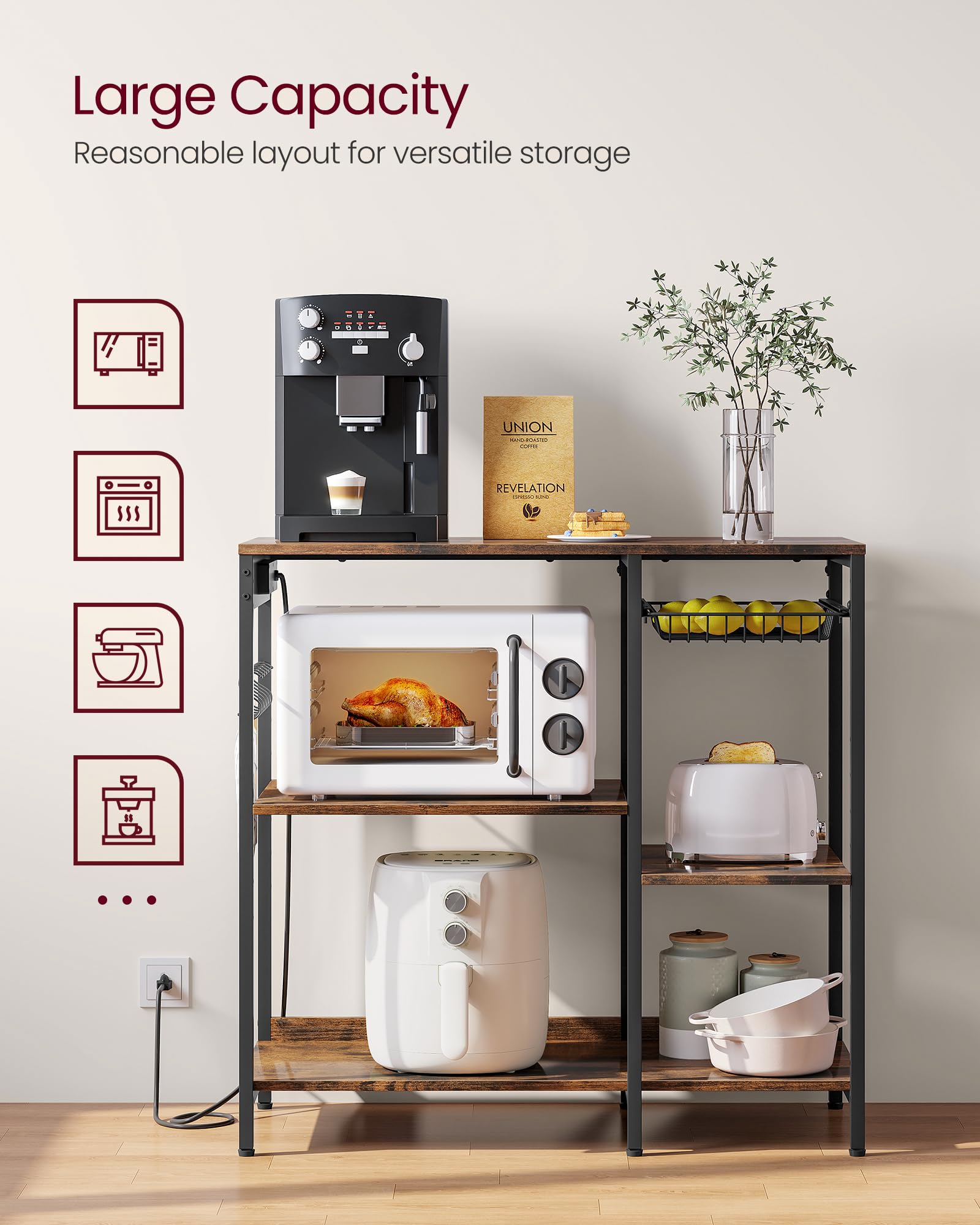 - [Baker’s Rack with Power Outlet] The power strip has 4 AC outlets to allow you to plug in multiple appliances, supporting up to 1875 watts. Its built-in design keeps the cord hidden for a tidy look