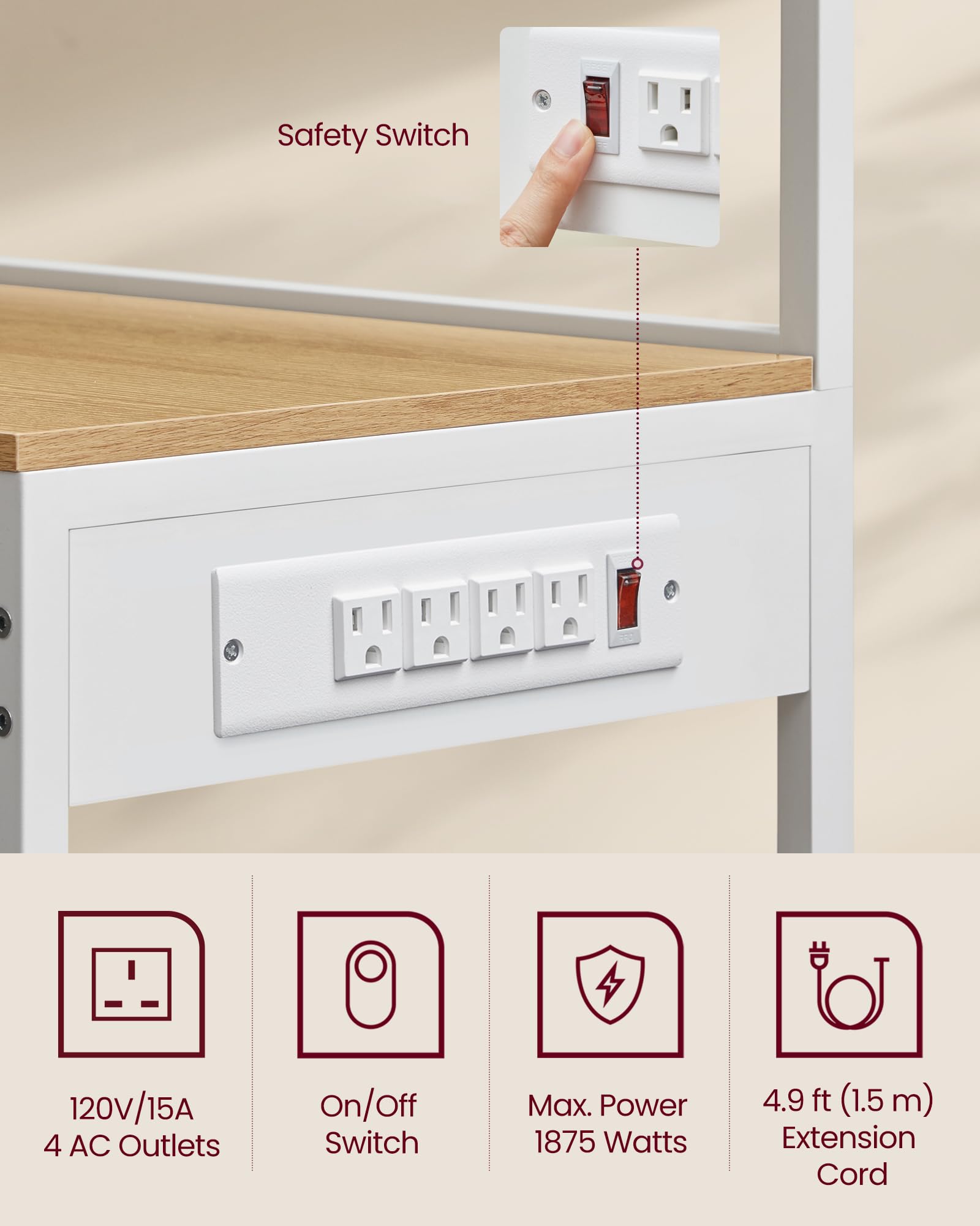 - [Safe Charging Station] This baker's rack features a power outlet with 4 AC outlets, equipped with overload, leakage protection, and an on/off switch, ensuring safe powering of multiple appliances