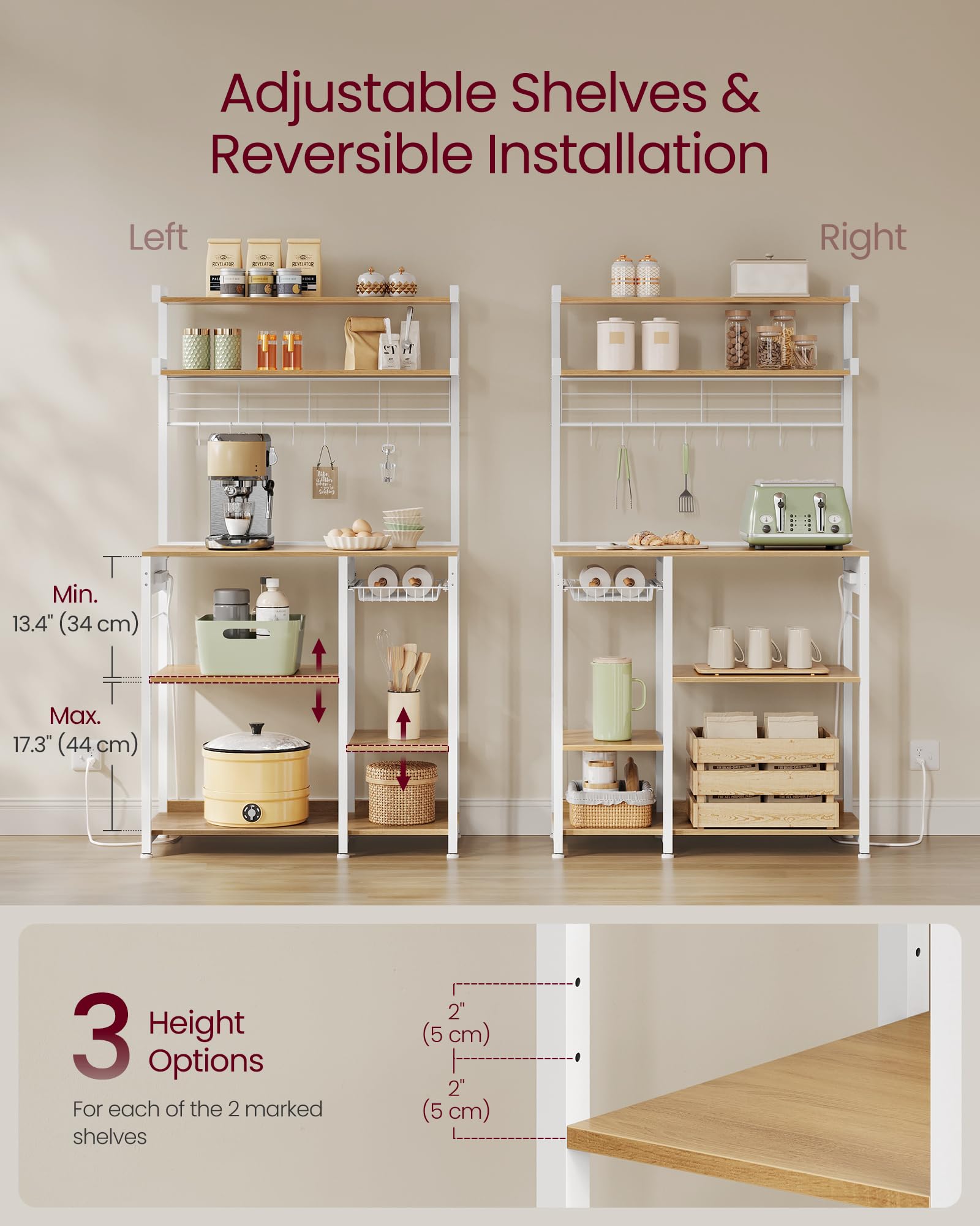 VASAGLE Bakers Rack with Power Outlet, 35.4 Inches Microwave Stand, Coffee Bar, 4 AC Outlets, with Adjustable Shelves, 8 S-Hooks, Basket, Spice Racks, Golden Oak and Cloud White UKKS031Y09
