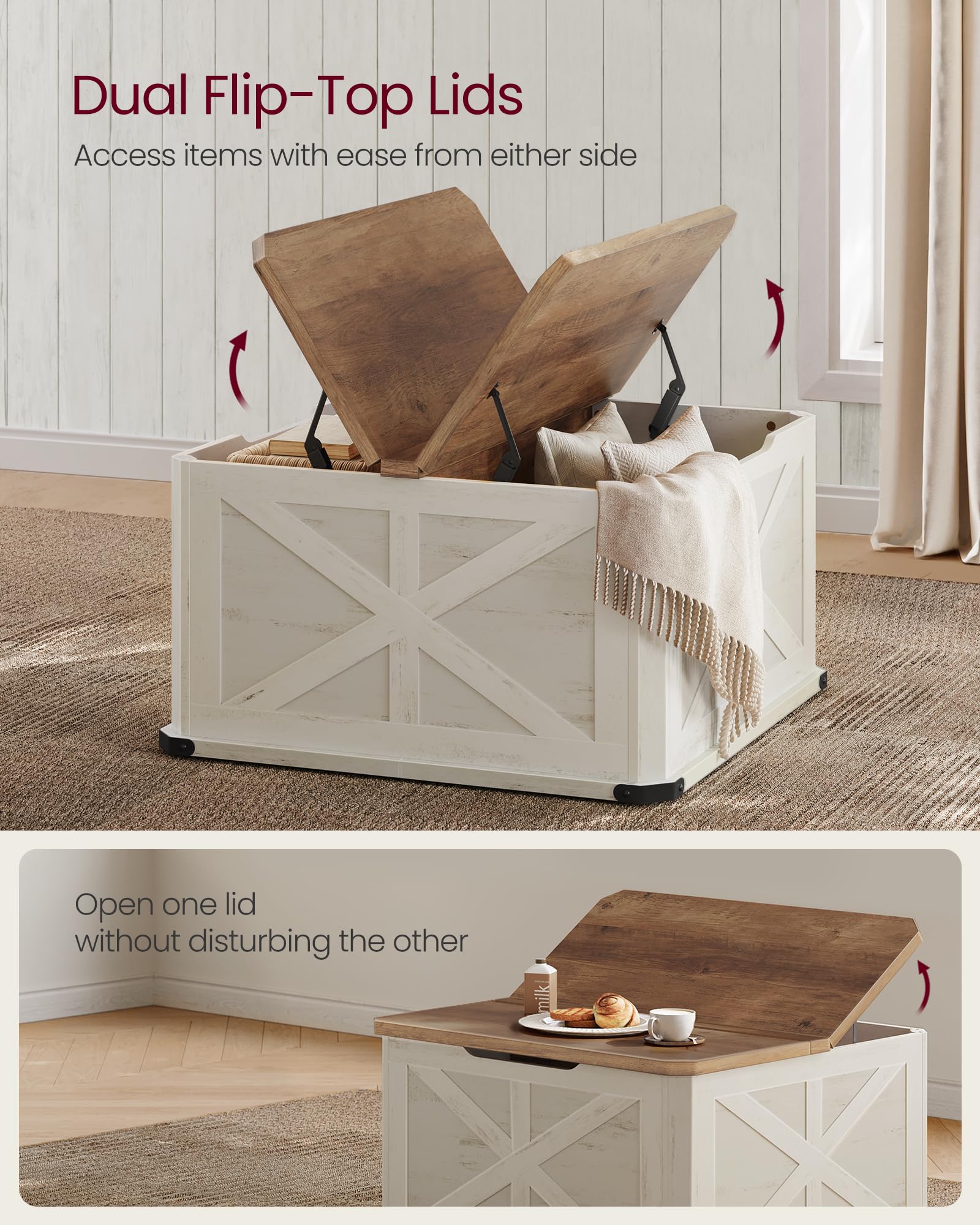 - 【SECURE FLIP-TOP LIDS】The 2 independent flip-top lids can remain open at any desired angle between 8-60°, enabling easy access to items from either side without pinching risks. Plus, the chamfered corners prevent accidental bumps