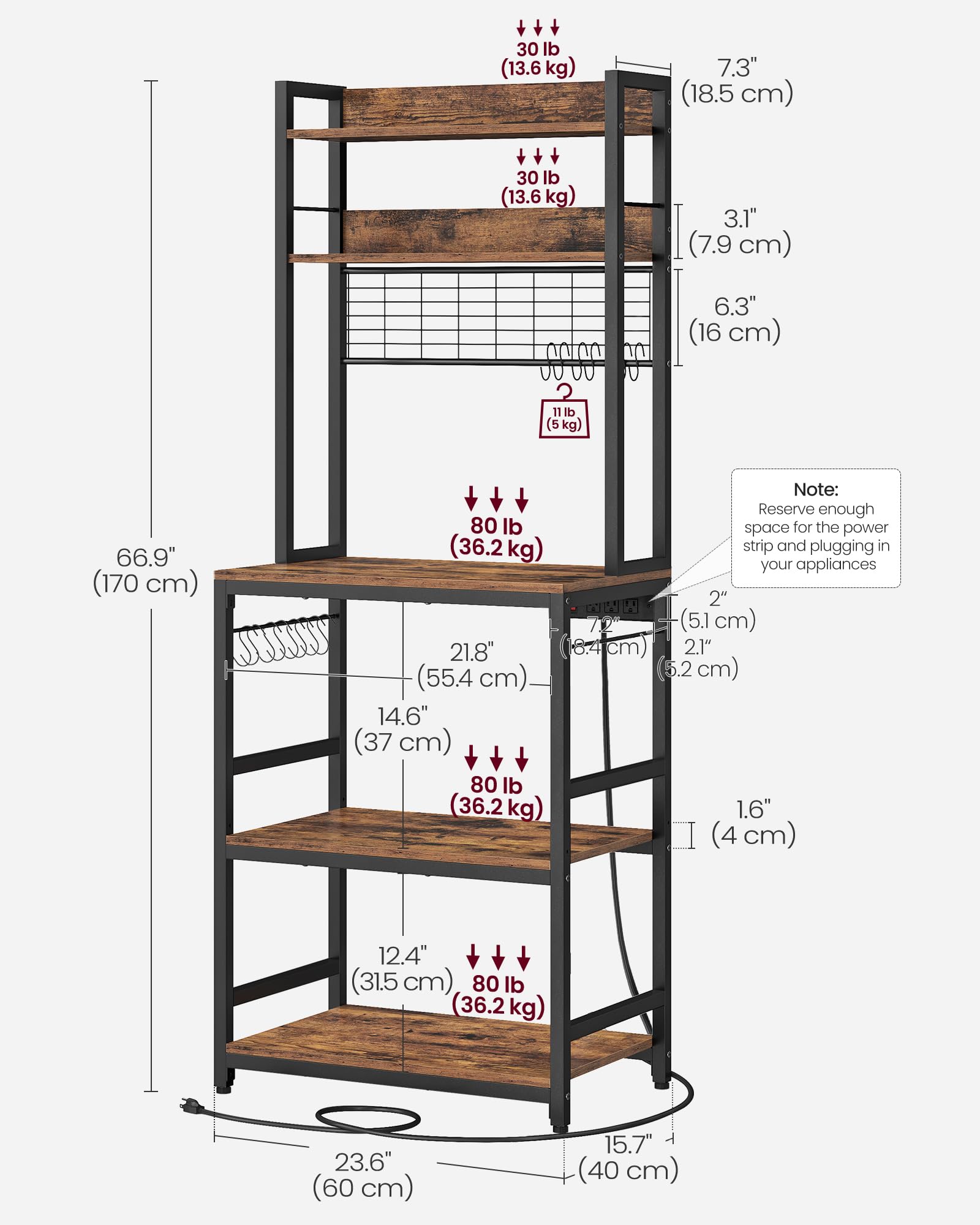 - [Safe, Reliable Power Strip] The built-in power strip of bakers racks for kitchens with storage features overload protection, leakage current protection, and an on-off switch that allows you to turn it off when not in use—all for safety!