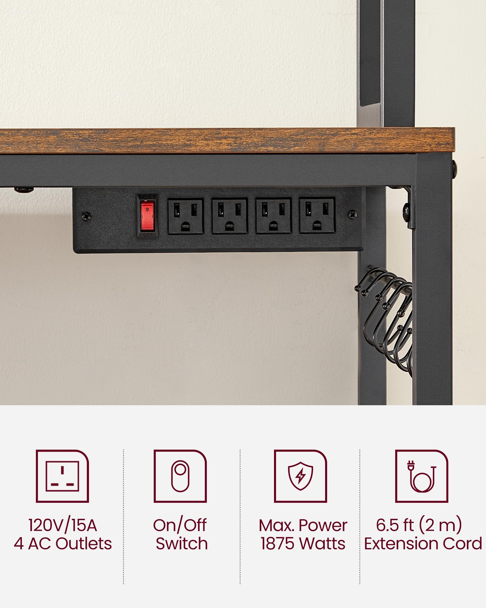 - [Baker’s Rack with Power Outlet] The power strip of kitchen baker rack has 4 AC outlets to allow you to plug in multiple appliances, supporting up to 1875 watts. The built-in design keeps all the cords well hidden throughout the shelves for a tidy look