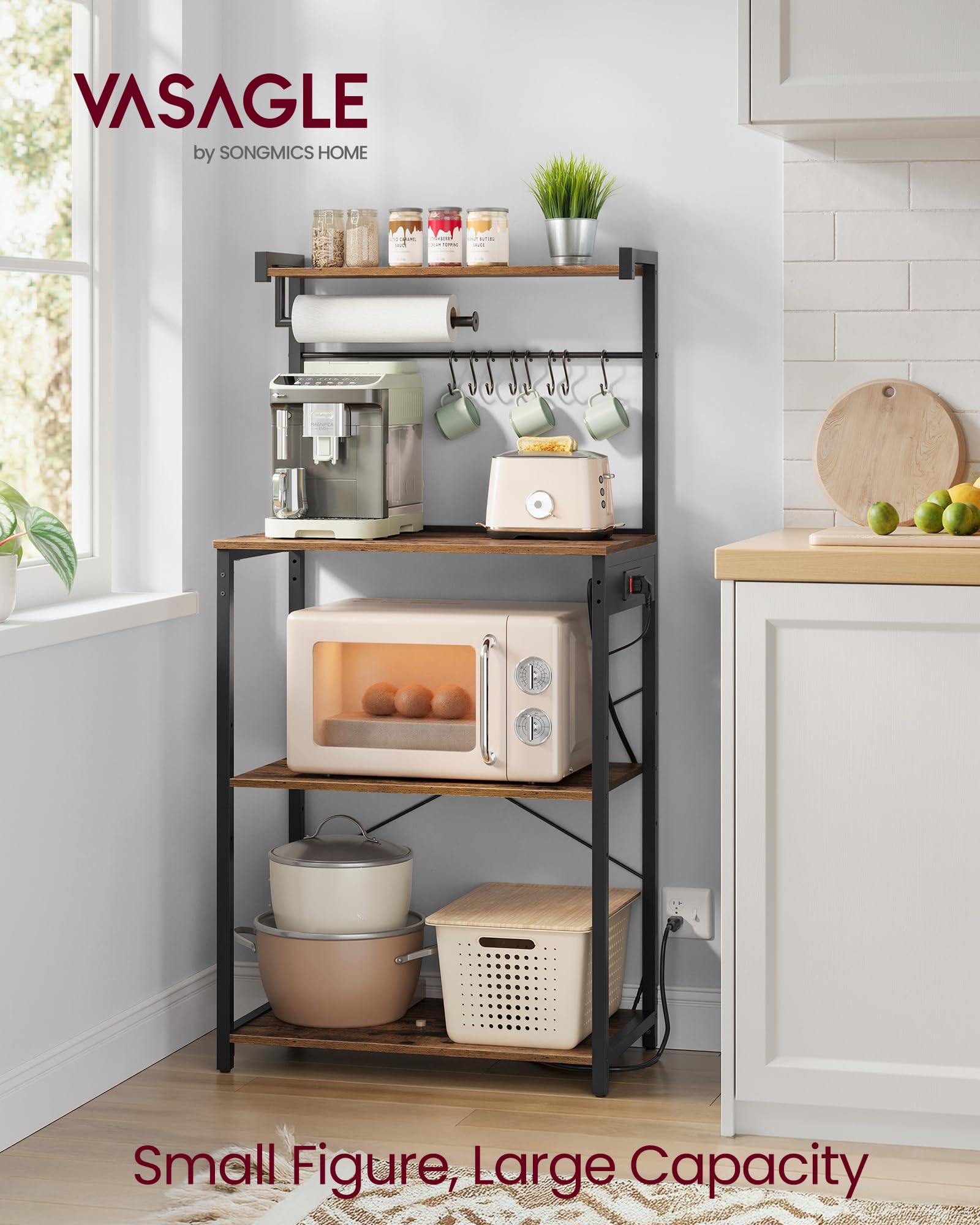 - Small Footprint, Big Capacity: This standing baker's rack has a small footprint but offers plenty of storage with a top shelf, 8 S-hooks, a paper towel holder, a large worktop, and 2 lower shelves