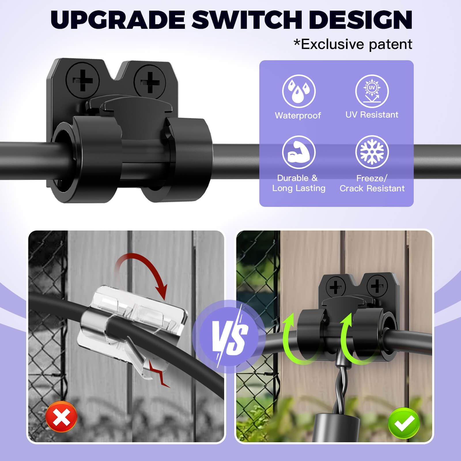 - Unique Patented Rotating Switch Hook Design: VEXON outdoor light clips rotating switch design makes it a breeze to install or remove your light strings. Enjoy the confidence of securely holding your decorations while easily switching them out whenever you want—no more worries about broken hooks or dropped bulbs during setup!