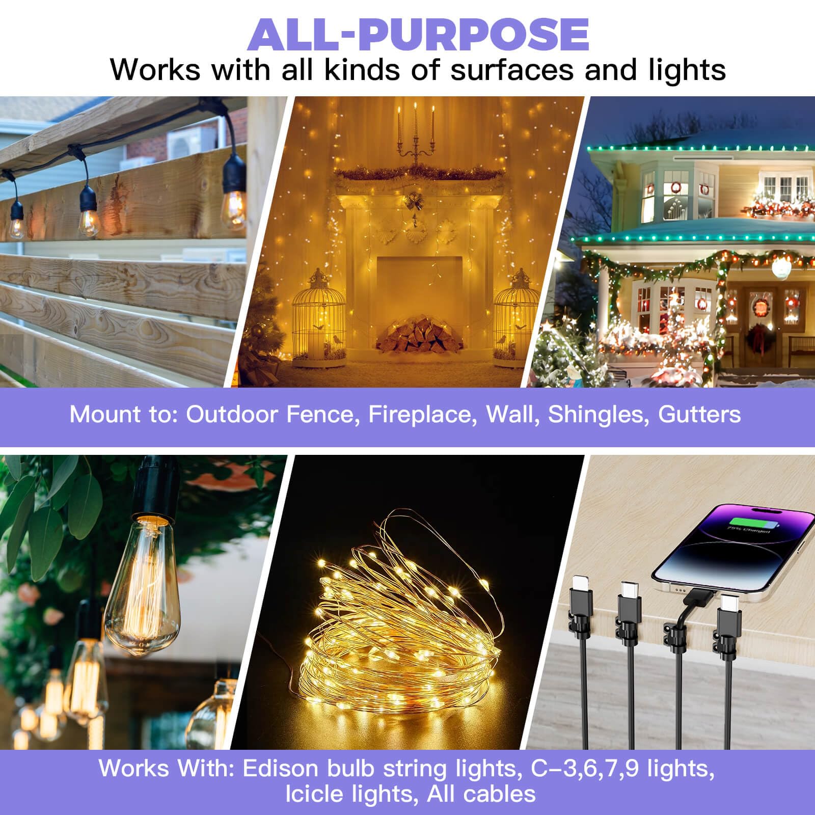- Versatile Applications: VEXON outdoor hooks for hanging accommodate a variety of light types, including Edison bulbs string lights, patio lights, holiday lights, solar string lights, LED string lights, Christmas decorations..etc. These christmas light hooks also help organize power cables, CAT-6 cables, and USB cords, making them a practical choice. Use them wherever you need, whether at home, in gutters, on patios, balconies, fences, pools, or even in your car and office!