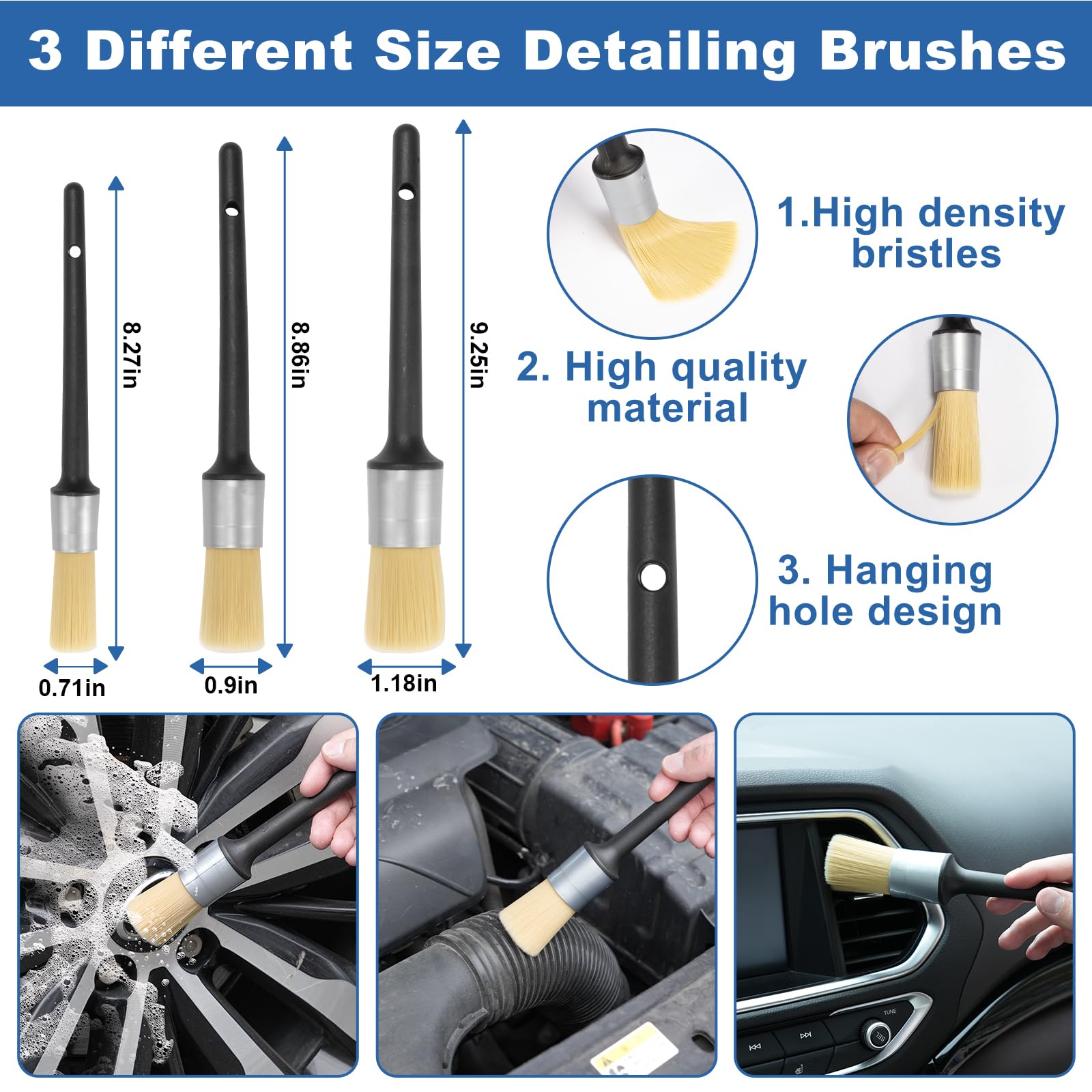 - Professional Brush Kit: 3 precision-sized detailing brushes tackle every surface - small brush cleans crevices/lug nuts, medium brush handles seats/dashboards, large brush efficiently scrubs wheels/engine bays. Complete with special vent and dash dusting tools
