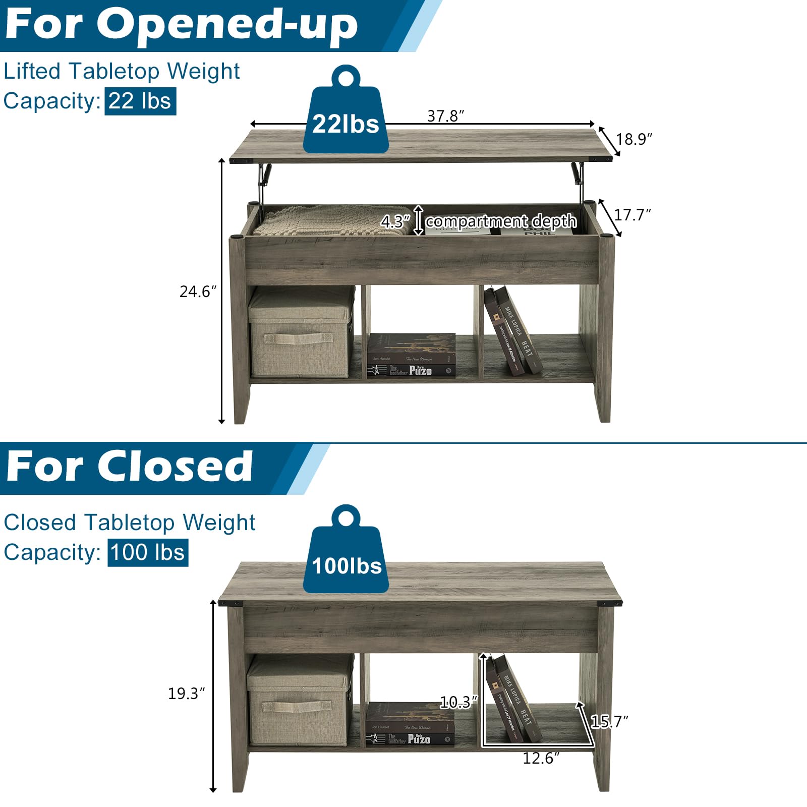 - 【Dimensions View】Table weight capacity with closed-up lifter: 100 lbs. Capacity for the liftable tray: 22lbs . Overall dimension: 38'L*19.5'W*24.6'H. Item weight: 46.5lbs.