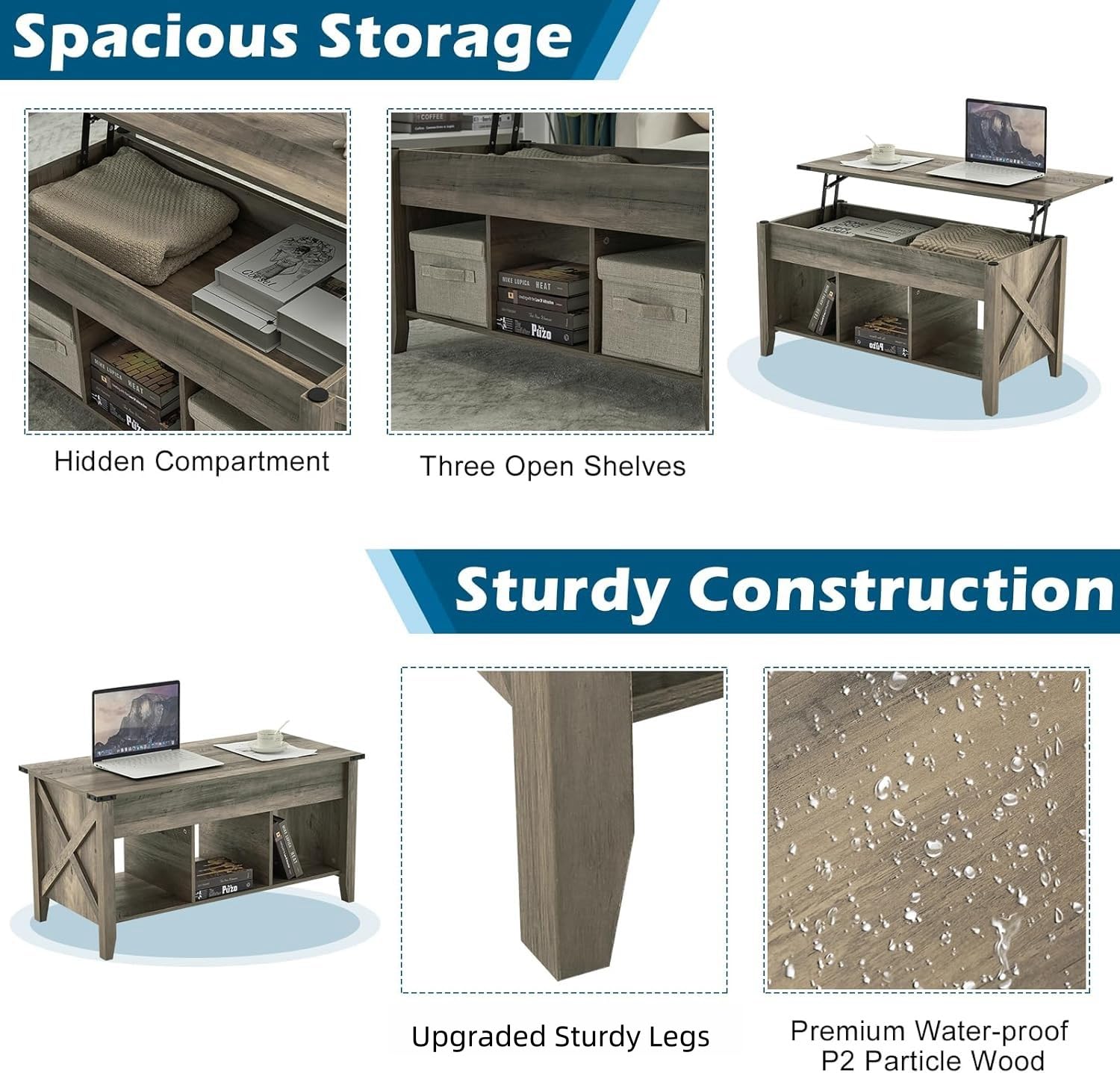 - 【Sturdily Built-up】The coffee table lift top body is in a neat and stable finish by using P2 particleboard with water-proof lamination over it.