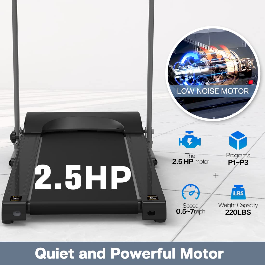 - 【2.5HP Powerful Motor】This treadmill for home features a 2.5HP powerful silent motor, supporting speeds from 0.5mph to 7.5mph and a weight capacity of up to 265lbs. Its quiet design allows for versatile use at home or in the office, enabling walking or running without disturbing others.