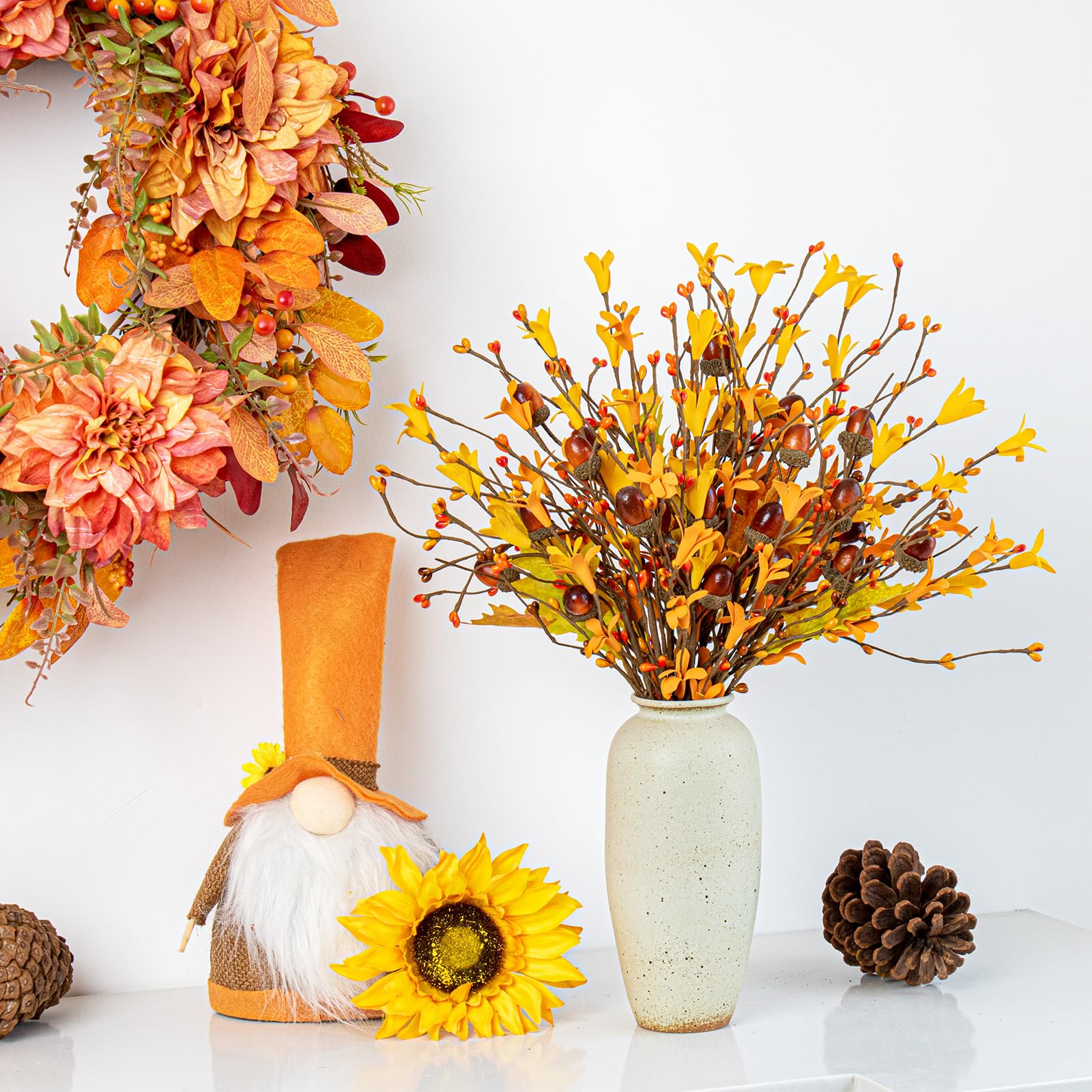 - 【Natural Appearance】: These artificial fall flowers feature a combination of two-tone autumn leaves, forsythia flowers, acorns, and berries. Their rich colors look incredibly natural, making them a perfect choice for fall decorations.