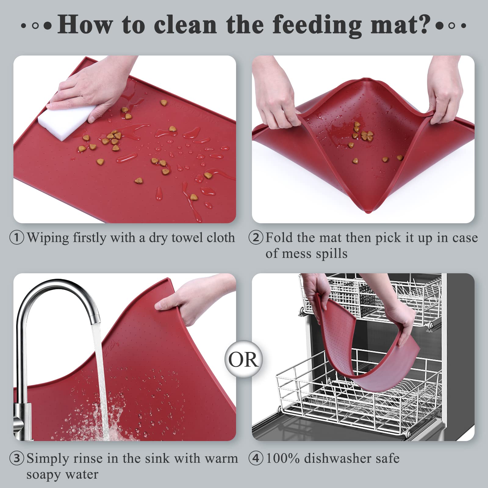 - ❤EASY TO USE & CLEAN : This dog mat for food and water is very easy to clean, simply rinse in the sink with warm soapy water, wipe with a cloth, wash it by hand under the sink or in a dishwasher. If a lot of water was spilt on mat, please kindly wiping firstly with a dry towel cloth. Thus the water would not spilled onto the floor when taking to clean