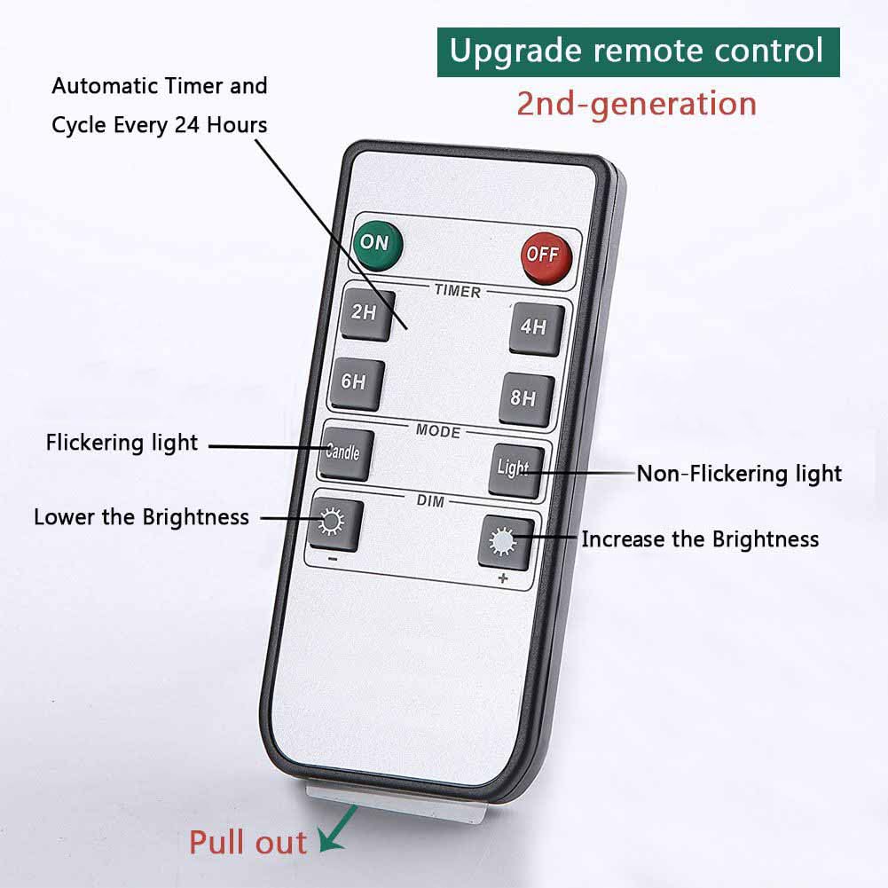 - ♥REMOTE CONTROL WITH TIMERS lets you turn the black flameless candles on or off without getting up.Timer feature lets you schedule your candles in 2-, 4-, 6- and 8-hour increments, cycling every 24 hours.The brightness of the candle can also be adjusted.