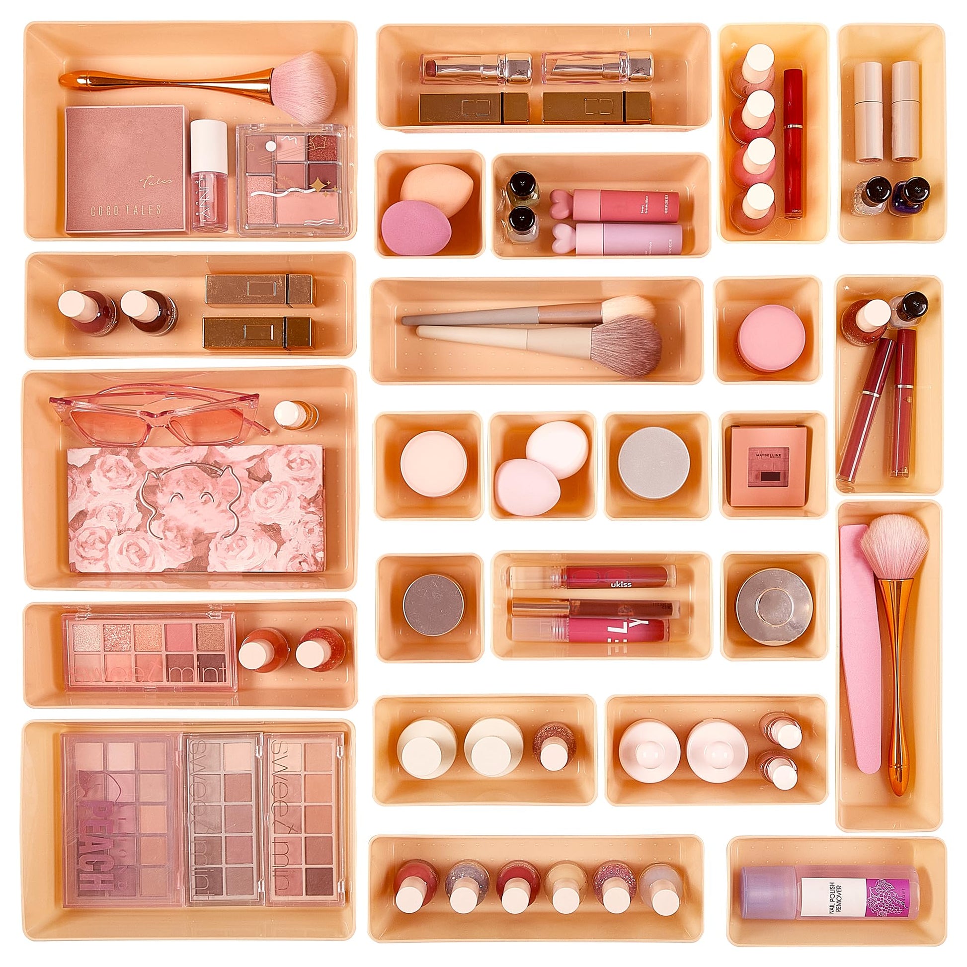 Vtopmart 25 PCS Clear Plastic Drawer Organizers Set, 4-Size Versatile Bathroom and Vanity Drawer Organizer Trays, Storage Bins for Makeup, Bedroom, Kitchen Gadgets Utensils and Office