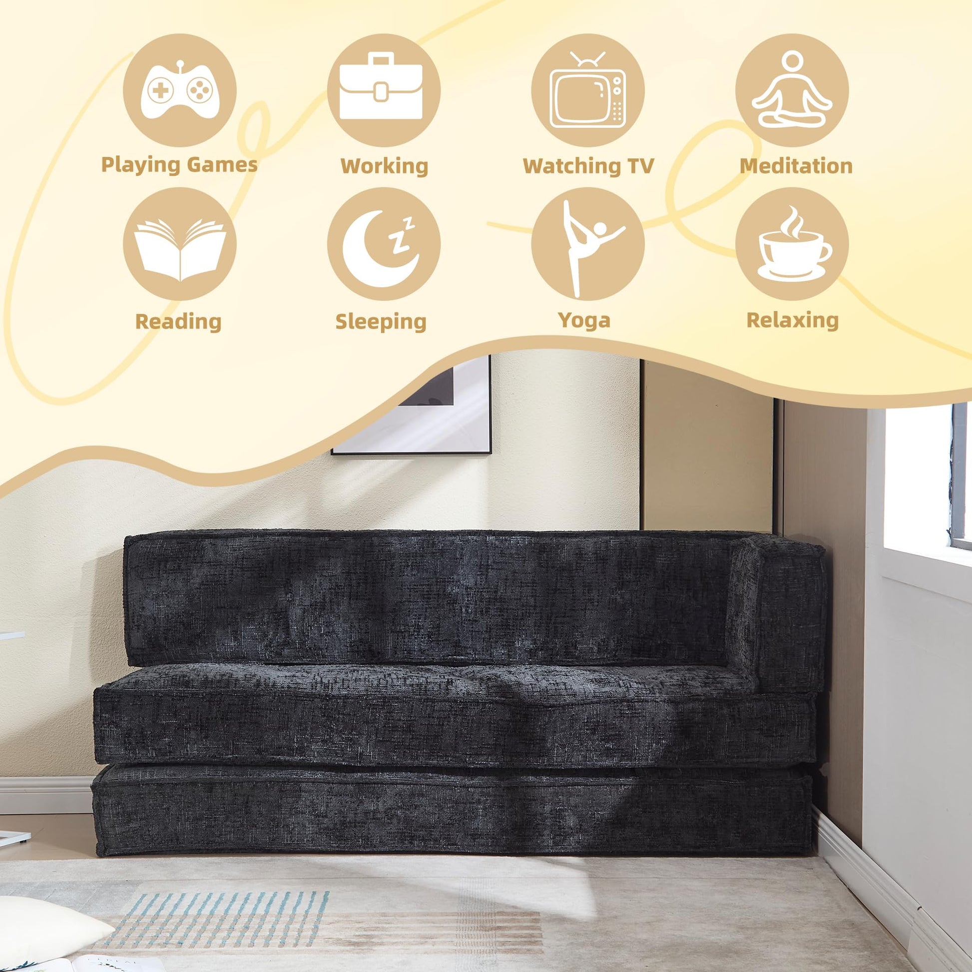 VYNELITO Modular Couch Convertible Sleeper Floor Sofa Bed, Chenille Folding Mattress Couch with Side Bag Storage, 4-in-1 Combined Lazy Sofa for Living Room Bedroom,Black