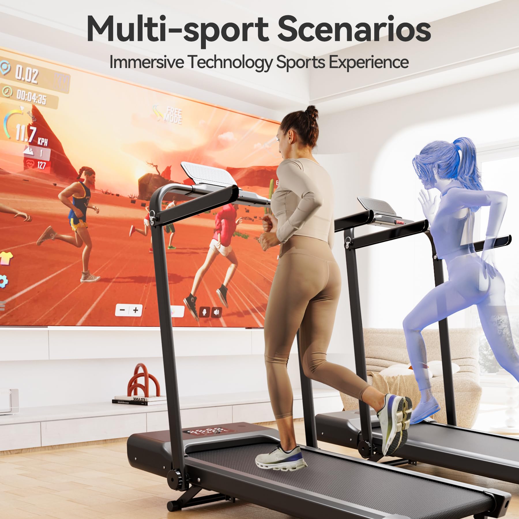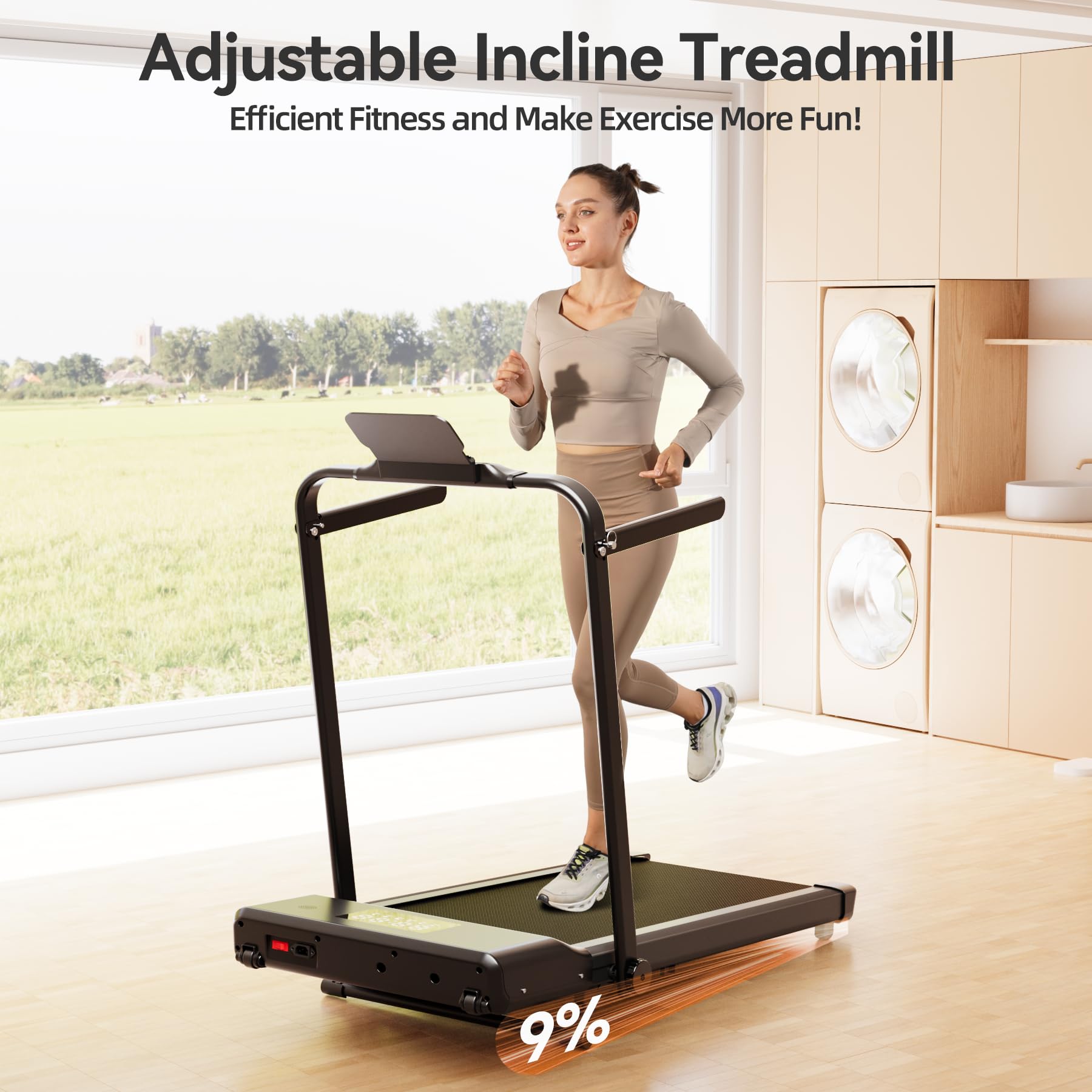 - Walking Pad Treadmill with 9% Incline : The Under Desk Treadmill combines a walking pad, folding treadmill, desk treadmill, and hill climber into one compact unit. With the handrail folded, it functions as an under-desk walking pad (0.6-3.8 mph) for light exercise. When raised, it supports jogging or running as treadmill at speeds of 0.6-7.5 mph . The 9% incline simulates hill climbing, enhancing fat-burning
