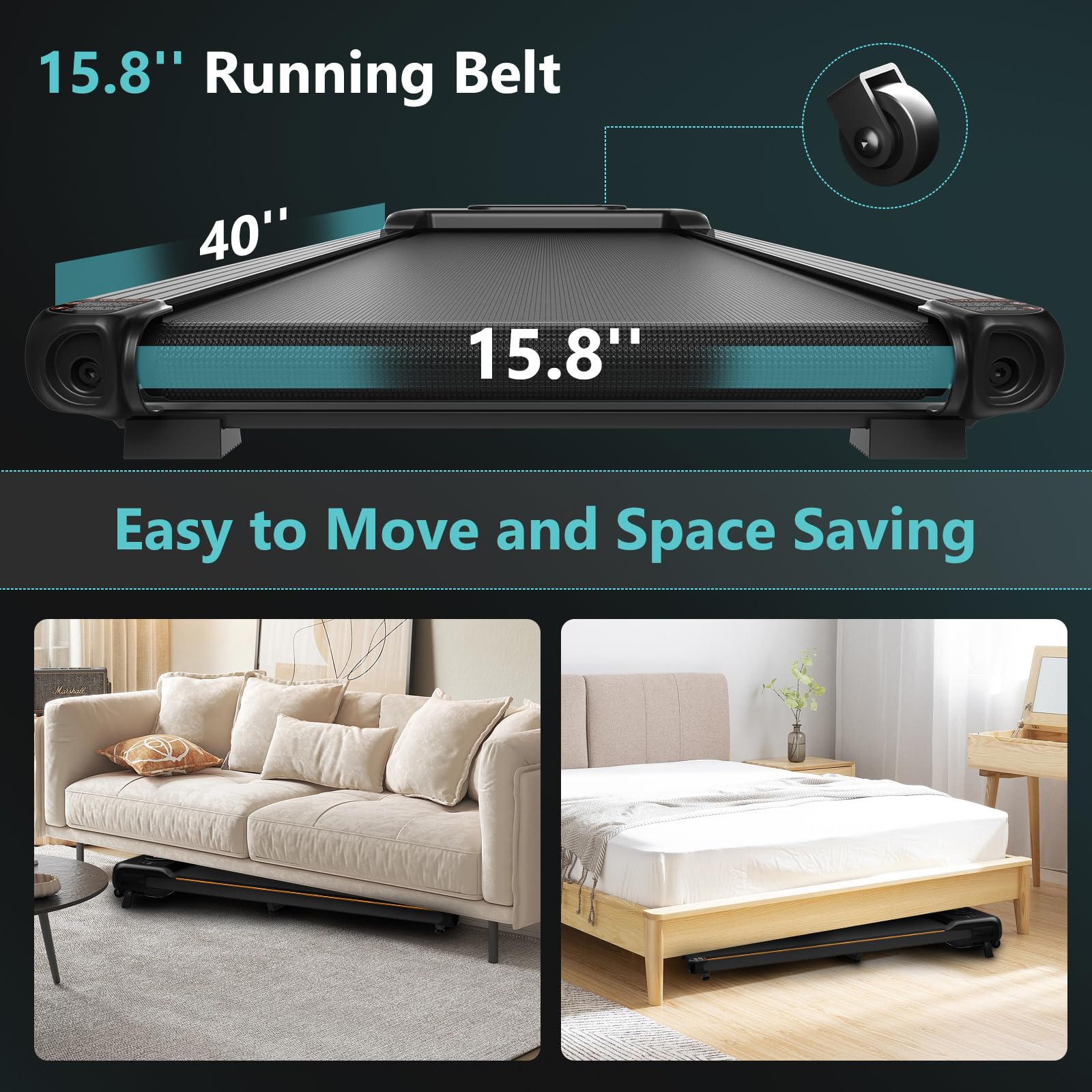 - Easy to Move and Store - Thickness of our compact treadmill is only 5.1'', which is easy to be stored under the sofa, desk or bed, making it a great space saver. The walking pad has two wheels on the front side and the machine weighs only 37lbs, so even girls can easily move it to any position you want.