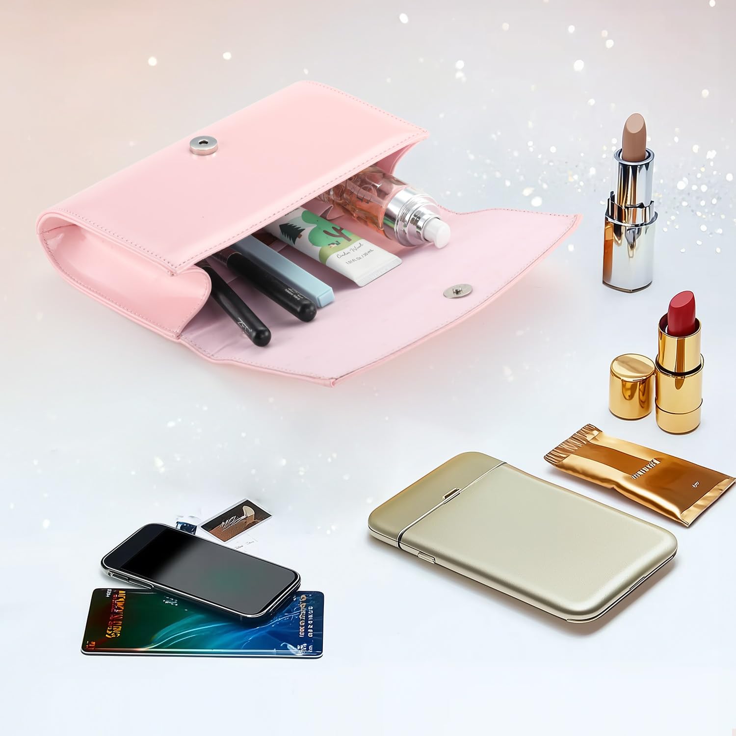 - Magnetic snap closure,made from high quality PU leather with frosted glitters and silver-tone chain strap.