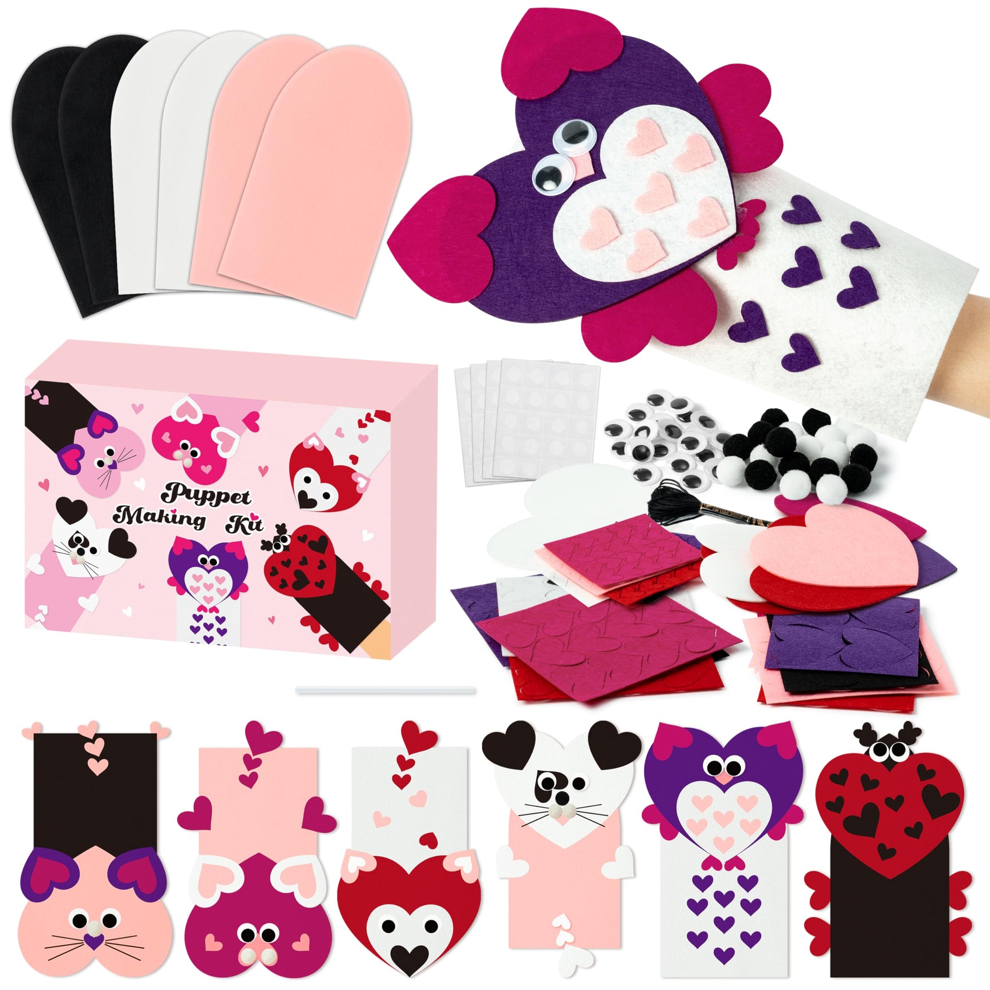 SUPER KIT - Package comes with 6pcs colorful hand puppets, 21pcs non-cutting felt patterns,1 bundle pompoms, 1 bundle googly eyes, 1 bundle pompoms eyes,1 bunch of black rope,1 sheet of rhinestones an