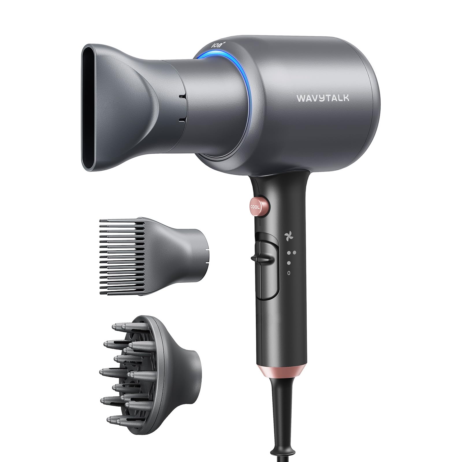 Wavytalk Blow Dryer, Blown Away Ionic Hair Dryer for Curly Hair with Diffuser, 1875W Fast Drying Blow Dryer with Ceramic Technology, 3 Attachments for All Hair Types, Light and Quiet, Grey