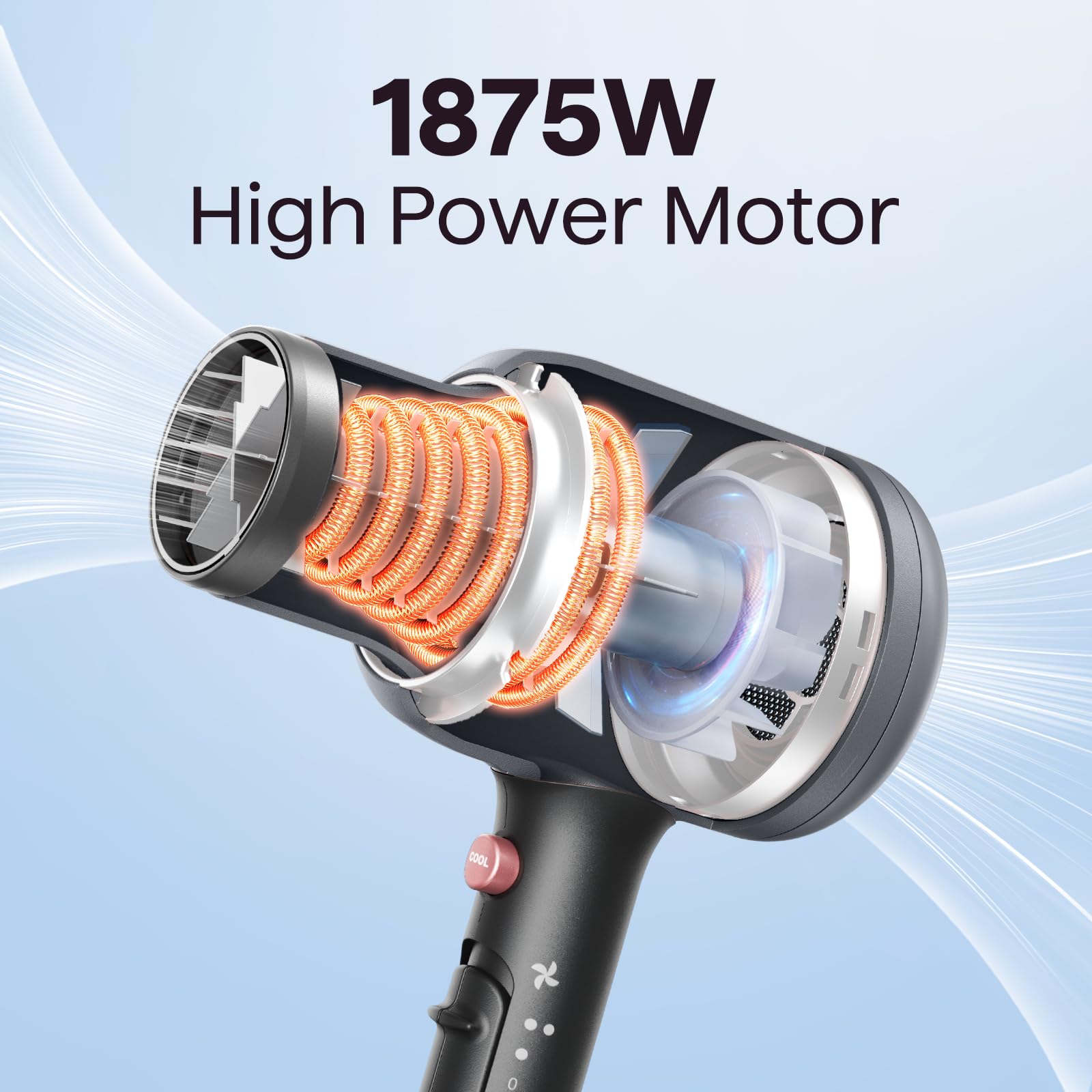 - 2x Faster Drying: Powered by a robust 1875W motor and advanced aerodynamic design, this ionic hair dryer delivers high-speed airflow to dry your hair twice as fast. Spend less time drying, avoid overheating, and minimize damage—all while achieving effortlessly sleek results.