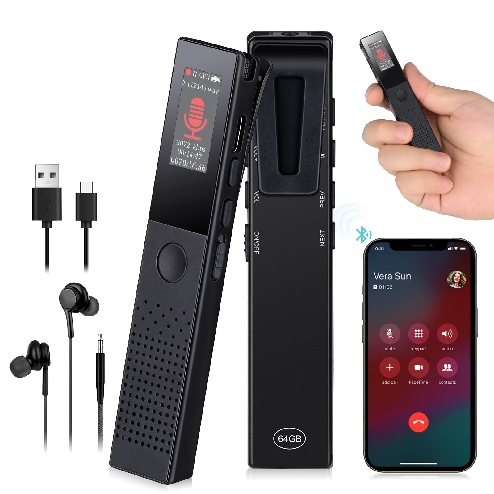 WearHome 64GB Digital Voice Recorder - Bluetooth Playback, 3072KBPS Voice Activation, Password Protection - Ideal for Lectures, Meetings, Interviews.